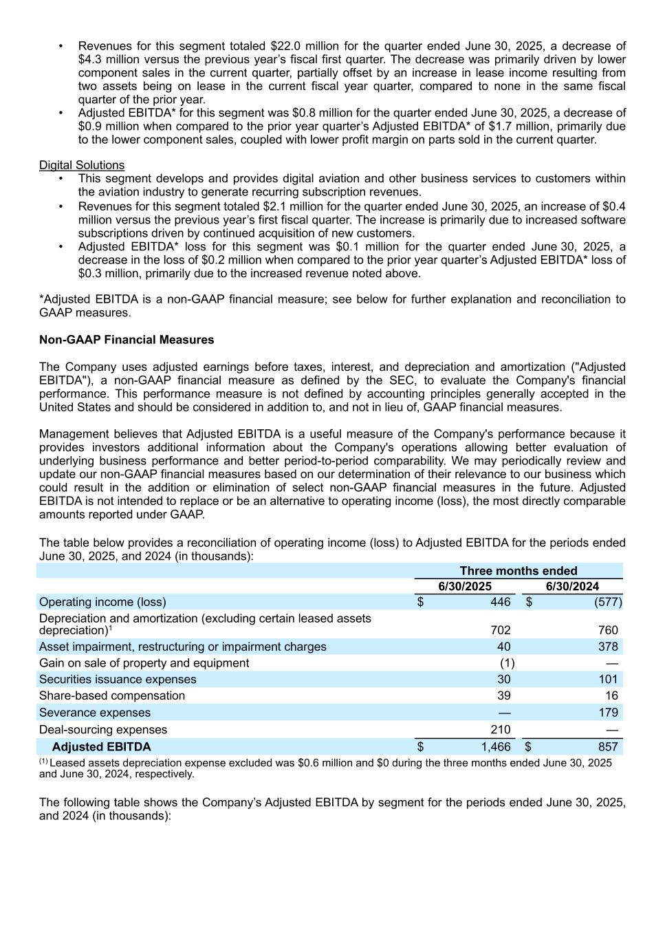 • Revenues for this segment totaled $22.0 million for the quarter ended June 30, 2025, a decrease of $4.3 million versus the previous year’s fiscal first quarter. The decrease was primarily driven by lower component sales in the current quarter, partially offset by an increase in lease income resulting from two assets being on lease in the current fiscal year quarter, compared to none in the same fiscal quarter of the prior year. • Adjusted EBITDA* for this segment was $0.8 million for the quarter ended June 30, 2025, a decrease of $0.9 million when compared to the prior year quarter’s Adjusted EBITDA* of $1.7 million, primarily due to the lower component sales, coupled with lower profit margin on parts sold in the current quarter. Digital Solutions • This segment develops and provides digital aviation and other business services to customers within the aviation industry to generate recurring subscription revenues. • Revenues for this segment totaled $2.1 million for the quarter ended June 30, 2025, an increase of $0.4 million versus the previous year’s first fiscal quarter. The increase is primarily due to increased software subscriptions driven by continued acquisition of new customers. • Adjusted EBITDA* loss for this segment was $0.1 million for the quarter ended June 30, 2025, a decrease in the loss of $0.2 million when compared to the prior year quarter’s Adjusted EBITDA* loss of $0.3 million, primarily due to the increased revenue noted above. *Adjusted EBITDA is a non-GAAP financial measure; see below for further explanation and reconciliation to GAAP measures. Non-GAAP Financial Measures The Company uses adjusted earnings before taxes, interest, and depreciation and amortization ("Adjusted EBITDA"), a non-GAAP financial measure as defined by the SEC, to evaluate the Company's financial performance. This performance measure is not defined by accounting principles generally accepted in the United States and should be considered in addition to, and not in lieu of, GAAP financial measures. Management believes that Adjusted EBITDA is a useful measure of the Company's performance because it provides investors additional information about the Company's operations allowing better evaluation of underlying business performance and better period-to-period comparability. We may periodically review and update our non-GAAP financial measures based on our determination of their relevance to our business which could result in the addition or elimination of select non-GAAP financial measures in the future. Adjusted EBITDA is not intended to replace or be an alternative to operating income (loss), the most directly comparable amounts reported under GAAP. The table below provides a reconciliation of operating income (loss) to Adjusted EBITDA for the periods ended June 30, 2025, and 2024 (in thousands): Three months ended 6/30/2025 6/30/2024 Operating income (loss) $ 446 $ (577) Depreciation and amortization (excluding certain leased assets depreciation)1 702 760 Asset impairment, restructuring or impairment charges 40 378 Gain on sale of property and equipment (1) — Securities issuance expenses 30 101 Share-based compensation 39 16 Severance expenses — 179 Deal-sourcing expenses 210 — Adjusted EBITDA $ 1,466 $ 857 (1) Leased assets depreciation expense excluded was $0.6 million and $0 during the three months ended June 30, 2025 and June 30, 2024, respectively. The following table shows the Company’s Adjusted EBITDA by segment for the periods ended June 30, 2025, and 2024 (in thousands):
