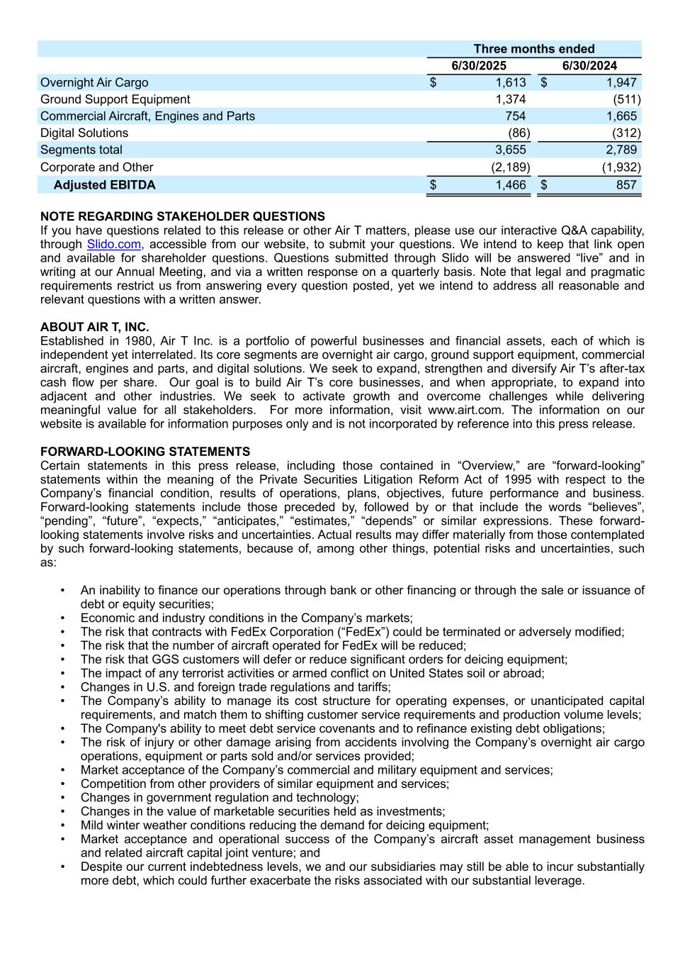 Three months ended 6/30/2025 6/30/2024 Overnight Air Cargo $ 1,613 $ 1,947 Ground Support Equipment 1,374 (511) Commercial Aircraft, Engines and Parts 754 1,665 Digital Solutions (86) (312) Segments total 3,655 2,789 Corporate and Other (2,189) (1,932) Adjusted EBITDA $ 1,466 $ 857 NOTE REGARDING STAKEHOLDER QUESTIONS If you have questions related to this release or other Air T matters, please use our interactive Q&A capability, through Slido.com, accessible from our website, to submit your questions. We intend to keep that link open and available for shareholder questions. Questions submitted through Slido will be answered “live” and in writing at our Annual Meeting, and via a written response on a quarterly basis. Note that legal and pragmatic requirements restrict us from answering every question posted, yet we intend to address all reasonable and relevant questions with a written answer. ABOUT AIR T, INC. Established in 1980, Air T Inc. is a portfolio of powerful businesses and financial assets, each of which is independent yet interrelated. Its core segments are overnight air cargo, ground support equipment, commercial aircraft, engines and parts, and digital solutions. We seek to expand, strengthen and diversify Air T’s after-tax cash flow per share. Our goal is to build Air T’s core businesses, and when appropriate, to expand into adjacent and other industries. We seek to activate growth and overcome challenges while delivering meaningful value for all stakeholders. For more information, visit www.airt.com. The information on our website is available for information purposes only and is not incorporated by reference into this press release. FORWARD-LOOKING STATEMENTS Certain statements in this press release, including those contained in “Overview,” are “forward-looking” statements within the meaning of the Private Securities Litigation Reform Act of 1995 with respect to the Company’s financial condition, results of operations, plans, objectives, future performance and business. Forward-looking statements include those preceded by, followed by or that include the words “believes”, “pending”, “future”, “expects,” “anticipates,” “estimates,” “depends” or similar expressions. These forward- looking statements involve risks and uncertainties. Actual results may differ materially from those contemplated by such forward-looking statements, because of, among other things, potential risks and uncertainties, such as: • An inability to finance our operations through bank or other financing or through the sale or issuance of debt or equity securities; • Economic and industry conditions in the Company’s markets; • The risk that contracts with FedEx Corporation (“FedEx”) could be terminated or adversely modified; • The risk that the number of aircraft operated for FedEx will be reduced; • The risk that GGS customers will defer or reduce significant orders for deicing equipment; • The impact of any terrorist activities or armed conflict on United States soil or abroad; • Changes in U.S. and foreign trade regulations and tariffs; • The Company’s ability to manage its cost structure for operating expenses, or unanticipated capital requirements, and match them to shifting customer service requirements and production volume levels; • The Company's ability to meet debt service covenants and to refinance existing debt obligations; • The risk of injury or other damage arising from accidents involving the Company’s overnight air cargo operations, equipment or parts sold and/or services provided; • Market acceptance of the Company’s commercial and military equipment and services; • Competition from other providers of similar equipment and services; • Changes in government regulation and technology; • Changes in the value of marketable securities held as investments; • Mild winter weather conditions reducing the demand for deicing equipment; • Market acceptance and operational success of the Company’s aircraft asset management business and related aircraft capital joint venture; and • Despite our current indebtedness levels, we and our subsidiaries may still be able to incur substantially more debt, which could further exacerbate the risks associated with our substantial leverage.