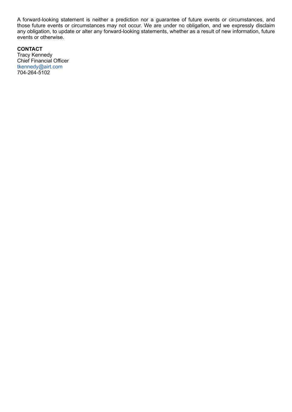 A forward-looking statement is neither a prediction nor a guarantee of future events or circumstances, and those future events or circumstances may not occur. We are under no obligation, and we expressly disclaim any obligation, to update or alter any forward-looking statements, whether as a result of new information, future events or otherwise. CONTACT Tracy Kennedy Chief Financial Officer tkennedy@airt.com 704-264-5102