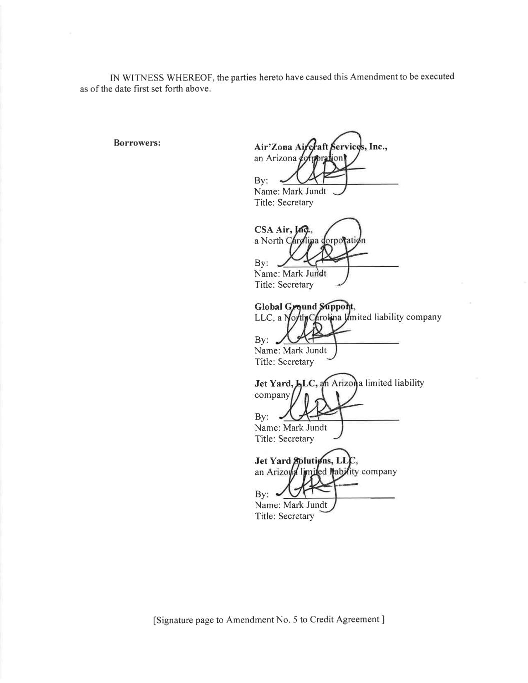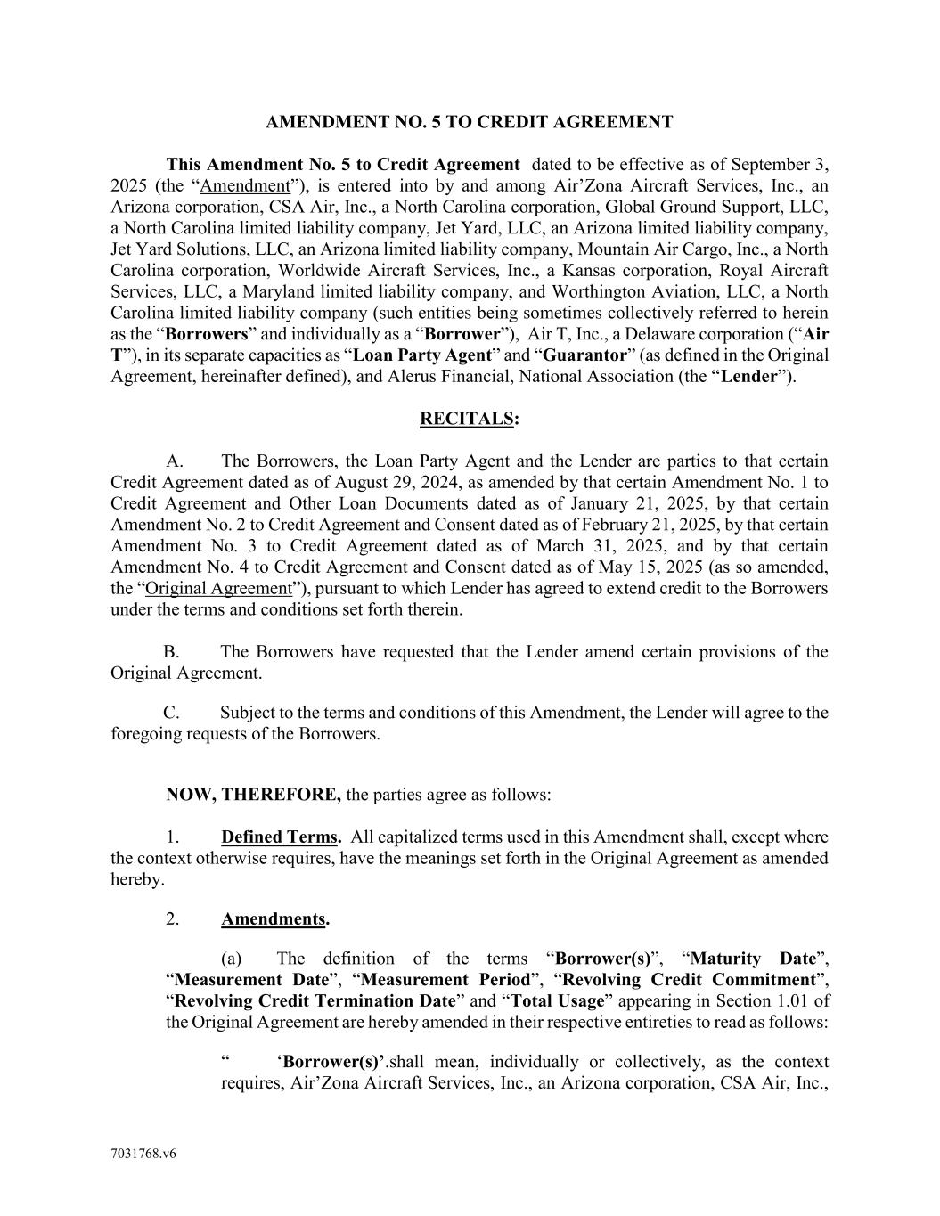 7031768.v6 AMENDMENT NO. 5 TO CREDIT AGREEMENT This Amendment No. 5 to Credit Agreement dated to be effective as of September 3, 2025 (the “Amendment”), is entered into by and among Air’Zona Aircraft Services, Inc., an Arizona corporation, CSA Air, Inc., a North Carolina corporation, Global Ground Support, LLC, a North Carolina limited liability company, Jet Yard, LLC, an Arizona limited liability company, Jet Yard Solutions, LLC, an Arizona limited liability company, Mountain Air Cargo, Inc., a North Carolina corporation, Worldwide Aircraft Services, Inc., a Kansas corporation, Royal Aircraft Services, LLC, a Maryland limited liability company, and Worthington Aviation, LLC, a North Carolina limited liability company (such entities being sometimes collectively referred to herein as the “Borrowers” and individually as a “Borrower”), Air T, Inc., a Delaware corporation (“Air T”), in its separate capacities as “Loan Party Agent” and “Guarantor” (as defined in the Original Agreement, hereinafter defined), and Alerus Financial, National Association (the “Lender”). RECITALS: A. The Borrowers, the Loan Party Agent and the Lender are parties to that certain Credit Agreement dated as of August 29, 2024, as amended by that certain Amendment No. 1 to Credit Agreement and Other Loan Documents dated as of January 21, 2025, by that certain Amendment No. 2 to Credit Agreement and Consent dated as of February 21, 2025, by that certain Amendment No. 3 to Credit Agreement dated as of March 31, 2025, and by that certain Amendment No. 4 to Credit Agreement and Consent dated as of May 15, 2025 (as so amended, the “Original Agreement”), pursuant to which Lender has agreed to extend credit to the Borrowers under the terms and conditions set forth therein. B. The Borrowers have requested that the Lender amend certain provisions of the Original Agreement. C. Subject to the terms and conditions of this Amendment, the Lender will agree to the foregoing requests of the Borrowers. NOW, THEREFORE, the parties agree as follows: 1. Defined Terms. All capitalized terms used in this Amendment shall, except where the context otherwise requires, have the meanings set forth in the Original Agreement as amended hereby. 2. Amendments. (a) The definition of the terms “Borrower(s)”, “Maturity Date”, “Measurement Date”, “Measurement Period”, “Revolving Credit Commitment”, “Revolving Credit Termination Date” and “Total Usage” appearing in Section 1.01 of the Original Agreement are hereby amended in their respective entireties to read as follows: “ ‘Borrower(s)’.shall mean, individually or collectively, as the context requires, Air’Zona Aircraft Services, Inc., an Arizona corporation, CSA Air, Inc.,