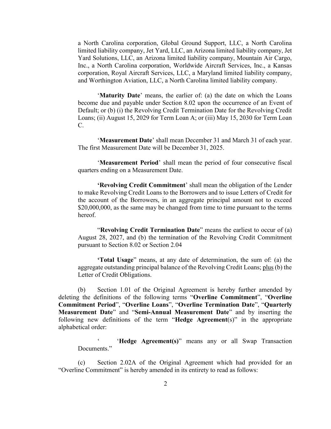 2 a North Carolina corporation, Global Ground Support, LLC, a North Carolina limited liability company, Jet Yard, LLC, an Arizona limited liability company, Jet Yard Solutions, LLC, an Arizona limited liability company, Mountain Air Cargo, Inc., a North Carolina corporation, Worldwide Aircraft Services, Inc., a Kansas corporation, Royal Aircraft Services, LLC, a Maryland limited liability company, and Worthington Aviation, LLC, a North Carolina limited liability company. ‘Maturity Date’ means, the earlier of: (a) the date on which the Loans become due and payable under Section 8.02 upon the occurrence of an Event of Default; or (b) (i) the Revolving Credit Termination Date for the Revolving Credit Loans; (ii) August 15, 2029 for Term Loan A; or (iii) May 15, 2030 for Term Loan C. ‘Measurement Date’ shall mean December 31 and March 31 of each year. The first Measurement Date will be December 31, 2025. ‘Measurement Period’ shall mean the period of four consecutive fiscal quarters ending on a Measurement Date. ‘Revolving Credit Commitment’ shall mean the obligation of the Lender to make Revolving Credit Loans to the Borrowers and to issue Letters of Credit for the account of the Borrowers, in an aggregate principal amount not to exceed $20,000,000, as the same may be changed from time to time pursuant to the terms hereof. “Revolving Credit Termination Date” means the earliest to occur of (a) August 28, 2027, and (b) the termination of the Revolving Credit Commitment pursuant to Section 8.02 or Section 2.04 ‘Total Usage” means, at any date of determination, the sum of: (a) the aggregate outstanding principal balance of the Revolving Credit Loans; plus (b) the Letter of Credit Obligations. (b) Section 1.01 of the Original Agreement is hereby further amended by deleting the definitions of the following terms “Overline Commitment”, “Overline Commitment Period”, “Overline Loans”, “Overline Termination Date”, “Quarterly Measurement Date” and “Semi-Annual Measurement Date” and by inserting the following new definitions of the term “Hedge Agreement(s)” in the appropriate alphabetical order: ‘ ‘Hedge Agreement(s)” means any or all Swap Transaction Documents.” (c) Section 2.02A of the Original Agreement which had provided for an “Overline Commitment” is hereby amended in its entirety to read as follows: