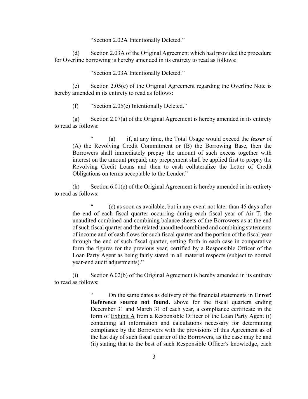 3 “Section 2.02A Intentionally Deleted.” (d) Section 2.03A of the Original Agreement which had provided the procedure for Overline borrowing is hereby amended in its entirety to read as follows: “Section 2.03A Intentionally Deleted.” (e) Section 2.05(c) of the Original Agreement regarding the Overline Note is hereby amended in its entirety to read as follows: (f) “Section 2.05(c) Intentionally Deleted.” (g) Section 2.07(a) of the Original Agreement is hereby amended in its entirety to read as follows: “ (a) if, at any time, the Total Usage would exceed the lesser of (A) the Revolving Credit Commitment or (B) the Borrowing Base, then the Borrowers shall immediately prepay the amount of such excess together with interest on the amount prepaid; any prepayment shall be applied first to prepay the Revolving Credit Loans and then to cash collateralize the Letter of Credit Obligations on terms acceptable to the Lender.” (h) Section 6.01(c) of the Original Agreement is hereby amended in its entirety to read as follows: “ (c) as soon as available, but in any event not later than 45 days after the end of each fiscal quarter occurring during each fiscal year of Air T, the unaudited combined and combining balance sheets of the Borrowers as at the end of such fiscal quarter and the related unaudited combined and combining statements of income and of cash flows for such fiscal quarter and the portion of the fiscal year through the end of such fiscal quarter, setting forth in each case in comparative form the figures for the previous year, certified by a Responsible Officer of the Loan Party Agent as being fairly stated in all material respects (subject to normal year-end audit adjustments).” (i) Section 6.02(b) of the Original Agreement is hereby amended in its entirety to read as follows: “ On the same dates as delivery of the financial statements in Error! Reference source not found. above for the fiscal quarters ending December 31 and March 31 of each year, a compliance certificate in the form of Exhibit A from a Responsible Officer of the Loan Party Agent (i) containing all information and calculations necessary for determining compliance by the Borrowers with the provisions of this Agreement as of the last day of such fiscal quarter of the Borrowers, as the case may be and (ii) stating that to the best of such Responsible Officer's knowledge, each
