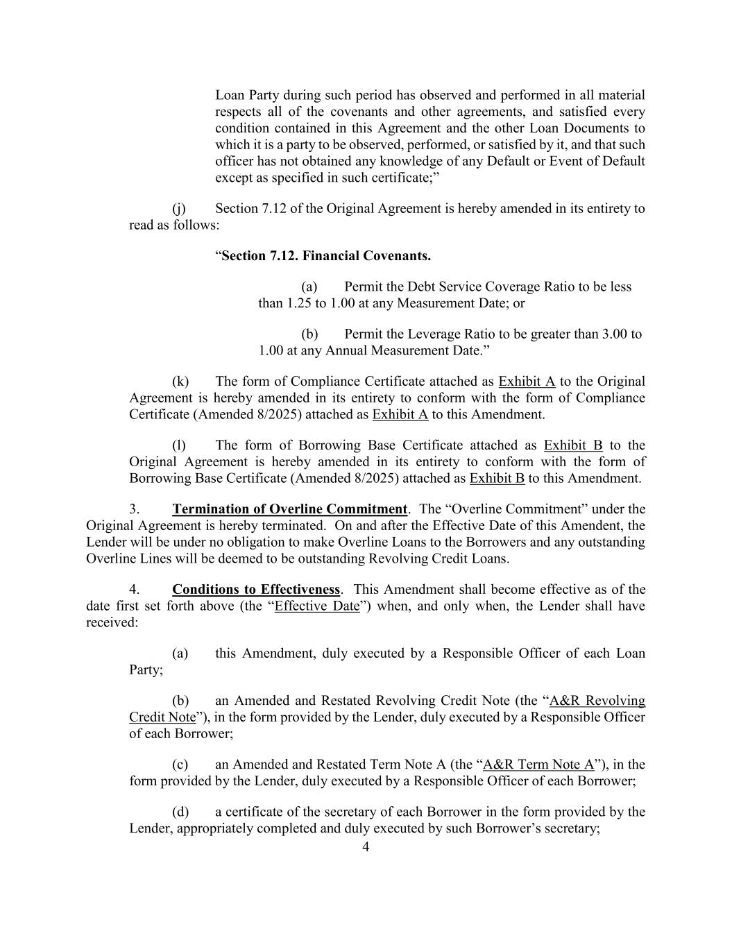 4 Loan Party during such period has observed and performed in all material respects all of the covenants and other agreements, and satisfied every condition contained in this Agreement and the other Loan Documents to which it is a party to be observed, performed, or satisfied by it, and that such officer has not obtained any knowledge of any Default or Event of Default except as specified in such certificate;” (j) Section 7.12 of the Original Agreement is hereby amended in its entirety to read as follows: “Section 7.12. Financial Covenants. (a) Permit the Debt Service Coverage Ratio to be less than 1.25 to 1.00 at any Measurement Date; or (b) Permit the Leverage Ratio to be greater than 3.00 to 1.00 at any Annual Measurement Date.” (k) The form of Compliance Certificate attached as Exhibit A to the Original Agreement is hereby amended in its entirety to conform with the form of Compliance Certificate (Amended 8/2025) attached as Exhibit A to this Amendment. (l) The form of Borrowing Base Certificate attached as Exhibit B to the Original Agreement is hereby amended in its entirety to conform with the form of Borrowing Base Certificate (Amended 8/2025) attached as Exhibit B to this Amendment. 3. Termination of Overline Commitment. The “Overline Commitment” under the Original Agreement is hereby terminated. On and after the Effective Date of this Amendent, the Lender will be under no obligation to make Overline Loans to the Borrowers and any outstanding Overline Lines will be deemed to be outstanding Revolving Credit Loans. 4. Conditions to Effectiveness. This Amendment shall become effective as of the date first set forth above (the “Effective Date”) when, and only when, the Lender shall have received: (a) this Amendment, duly executed by a Responsible Officer of each Loan Party; (b) an Amended and Restated Revolving Credit Note (the “A&R Revolving Credit Note”), in the form provided by the Lender, duly executed by a Responsible Officer of each Borrower; (c) an Amended and Restated Term Note A (the “A&R Term Note A”), in the form provided by the Lender, duly executed by a Responsible Officer of each Borrower; (d) a certificate of the secretary of each Borrower in the form provided by the Lender, appropriately completed and duly executed by such Borrower’s secretary;