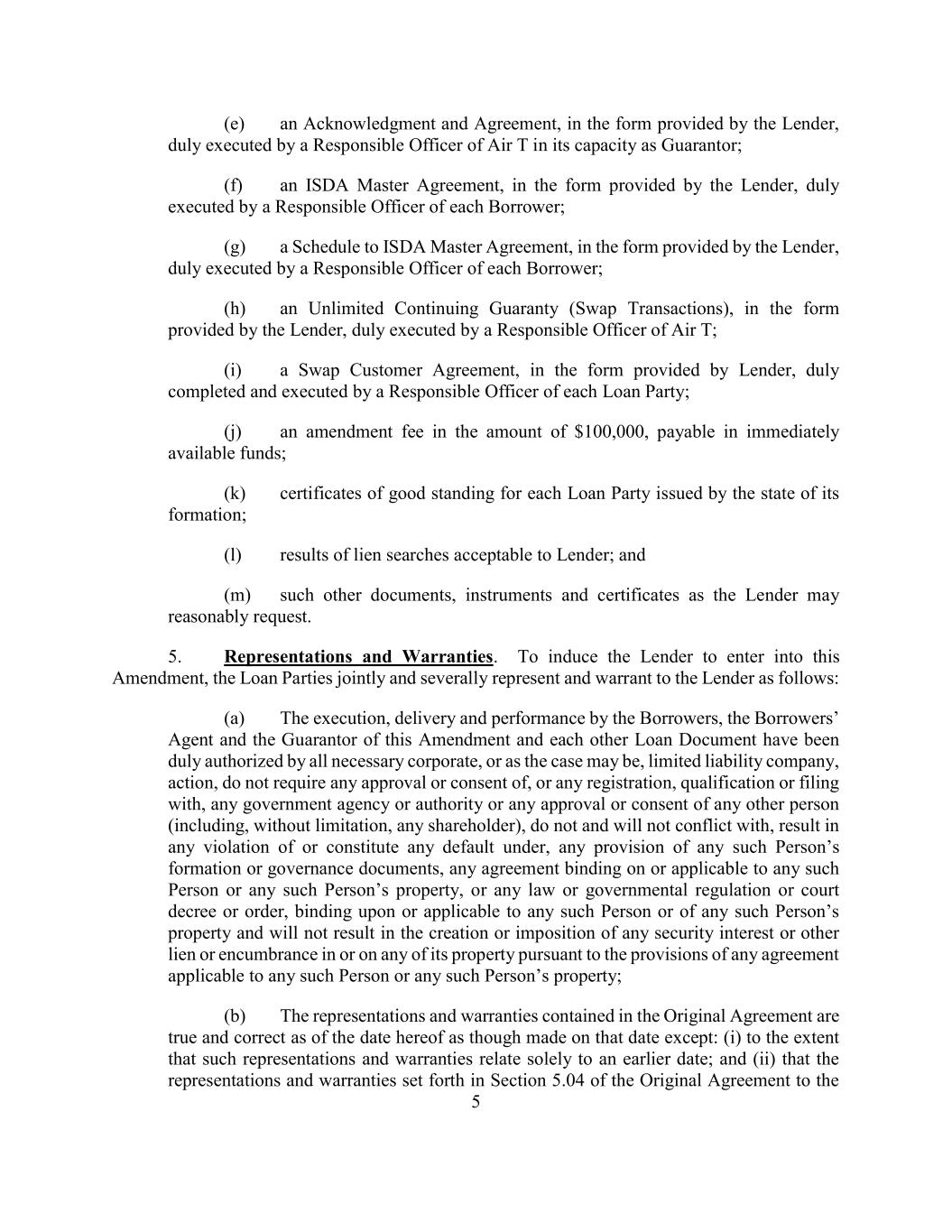 5 (e) an Acknowledgment and Agreement, in the form provided by the Lender, duly executed by a Responsible Officer of Air T in its capacity as Guarantor; (f) an ISDA Master Agreement, in the form provided by the Lender, duly executed by a Responsible Officer of each Borrower; (g) a Schedule to ISDA Master Agreement, in the form provided by the Lender, duly executed by a Responsible Officer of each Borrower; (h) an Unlimited Continuing Guaranty (Swap Transactions), in the form provided by the Lender, duly executed by a Responsible Officer of Air T; (i) a Swap Customer Agreement, in the form provided by Lender, duly completed and executed by a Responsible Officer of each Loan Party; (j) an amendment fee in the amount of $100,000, payable in immediately available funds; (k) certificates of good standing for each Loan Party issued by the state of its formation; (l) results of lien searches acceptable to Lender; and (m) such other documents, instruments and certificates as the Lender may reasonably request. 5. Representations and Warranties. To induce the Lender to enter into this Amendment, the Loan Parties jointly and severally represent and warrant to the Lender as follows: (a) The execution, delivery and performance by the Borrowers, the Borrowers’ Agent and the Guarantor of this Amendment and each other Loan Document have been duly authorized by all necessary corporate, or as the case may be, limited liability company, action, do not require any approval or consent of, or any registration, qualification or filing with, any government agency or authority or any approval or consent of any other person (including, without limitation, any shareholder), do not and will not conflict with, result in any violation of or constitute any default under, any provision of any such Person’s formation or governance documents, any agreement binding on or applicable to any such Person or any such Person’s property, or any law or governmental regulation or court decree or order, binding upon or applicable to any such Person or of any such Person’s property and will not result in the creation or imposition of any security interest or other lien or encumbrance in or on any of its property pursuant to the provisions of any agreement applicable to any such Person or any such Person’s property; (b) The representations and warranties contained in the Original Agreement are true and correct as of the date hereof as though made on that date except: (i) to the extent that such representations and warranties relate solely to an earlier date; and (ii) that the representations and warranties set forth in Section 5.04 of the Original Agreement to the