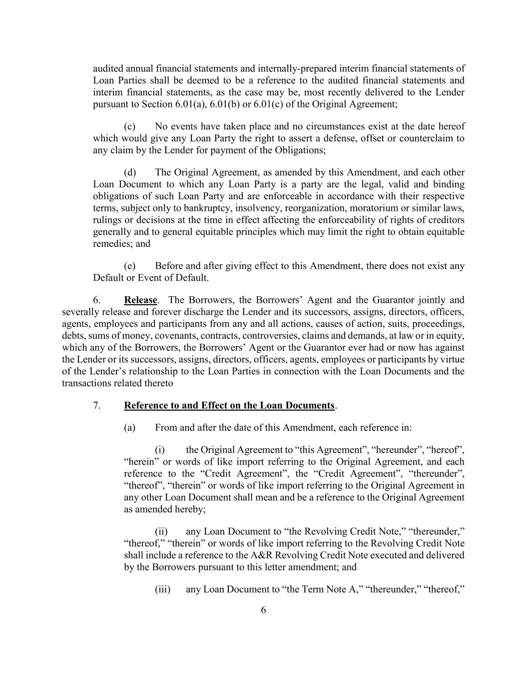 6 audited annual financial statements and internally-prepared interim financial statements of Loan Parties shall be deemed to be a reference to the audited financial statements and interim financial statements, as the case may be, most recently delivered to the Lender pursuant to Section 6.01(a), 6.01(b) or 6.01(c) of the Original Agreement; (c) No events have taken place and no circumstances exist at the date hereof which would give any Loan Party the right to assert a defense, offset or counterclaim to any claim by the Lender for payment of the Obligations; (d) The Original Agreement, as amended by this Amendment, and each other Loan Document to which any Loan Party is a party are the legal, valid and binding obligations of such Loan Party and are enforceable in accordance with their respective terms, subject only to bankruptcy, insolvency, reorganization, moratorium or similar laws, rulings or decisions at the time in effect affecting the enforceability of rights of creditors generally and to general equitable principles which may limit the right to obtain equitable remedies; and (e) Before and after giving effect to this Amendment, there does not exist any Default or Event of Default. 6. Release. The Borrowers, the Borrowers’ Agent and the Guarantor jointly and severally release and forever discharge the Lender and its successors, assigns, directors, officers, agents, employees and participants from any and all actions, causes of action, suits, proceedings, debts, sums of money, covenants, contracts, controversies, claims and demands, at law or in equity, which any of the Borrowers, the Borrowers’ Agent or the Guarantor ever had or now has against the Lender or its successors, assigns, directors, officers, agents, employees or participants by virtue of the Lender’s relationship to the Loan Parties in connection with the Loan Documents and the transactions related thereto 7. Reference to and Effect on the Loan Documents. (a) From and after the date of this Amendment, each reference in: (i) the Original Agreement to “this Agreement”, “hereunder”, “hereof”, “herein” or words of like import referring to the Original Agreement, and each reference to the “Credit Agreement”, the “Credit Agreement”, “thereunder”, “thereof”, “therein” or words of like import referring to the Original Agreement in any other Loan Document shall mean and be a reference to the Original Agreement as amended hereby; (ii) any Loan Document to “the Revolving Credit Note,” “thereunder,” “thereof,” “therein” or words of like import referring to the Revolving Credit Note shall include a reference to the A&R Revolving Credit Note executed and delivered by the Borrowers pursuant to this letter amendment; and (iii) any Loan Document to “the Term Note A,” “thereunder,” “thereof,”