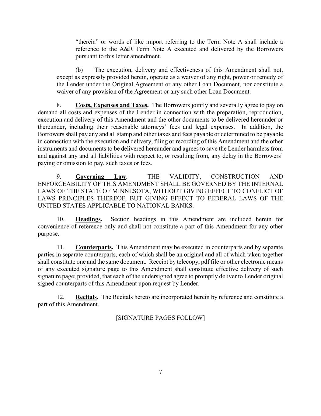 7 “therein” or words of like import referring to the Term Note A shall include a reference to the A&R Term Note A executed and delivered by the Borrowers pursuant to this letter amendment. (b) The execution, delivery and effectiveness of this Amendment shall not, except as expressly provided herein, operate as a waiver of any right, power or remedy of the Lender under the Original Agreement or any other Loan Document, nor constitute a waiver of any provision of the Agreement or any such other Loan Document. 8. Costs, Expenses and Taxes. The Borrowers jointly and severally agree to pay on demand all costs and expenses of the Lender in connection with the preparation, reproduction, execution and delivery of this Amendment and the other documents to be delivered hereunder or thereunder, including their reasonable attorneys’ fees and legal expenses. In addition, the Borrowers shall pay any and all stamp and other taxes and fees payable or determined to be payable in connection with the execution and delivery, filing or recording of this Amendment and the other instruments and documents to be delivered hereunder and agrees to save the Lender harmless from and against any and all liabilities with respect to, or resulting from, any delay in the Borrowers’ paying or omission to pay, such taxes or fees. 9. Governing Law. THE VALIDITY, CONSTRUCTION AND ENFORCEABILITY OF THIS AMENDMENT SHALL BE GOVERNED BY THE INTERNAL LAWS OF THE STATE OF MINNESOTA, WITHOUT GIVING EFFECT TO CONFLICT OF LAWS PRINCIPLES THEREOF, BUT GIVING EFFECT TO FEDERAL LAWS OF THE UNITED STATES APPLICABLE TO NATIONAL BANKS. 10. Headings. Section headings in this Amendment are included herein for convenience of reference only and shall not constitute a part of this Amendment for any other purpose. 11. Counterparts. This Amendment may be executed in counterparts and by separate parties in separate counterparts, each of which shall be an original and all of which taken together shall constitute one and the same document. Receipt by telecopy, pdf file or other electronic means of any executed signature page to this Amendment shall constitute effective delivery of such signature page; provided, that each of the undersigned agree to promptly deliver to Lender original signed counterparts of this Amendment upon request by Lender. 12. Recitals. The Recitals hereto are incorporated herein by reference and constitute a part of this Amendment. [SIGNATURE PAGES FOLLOW]