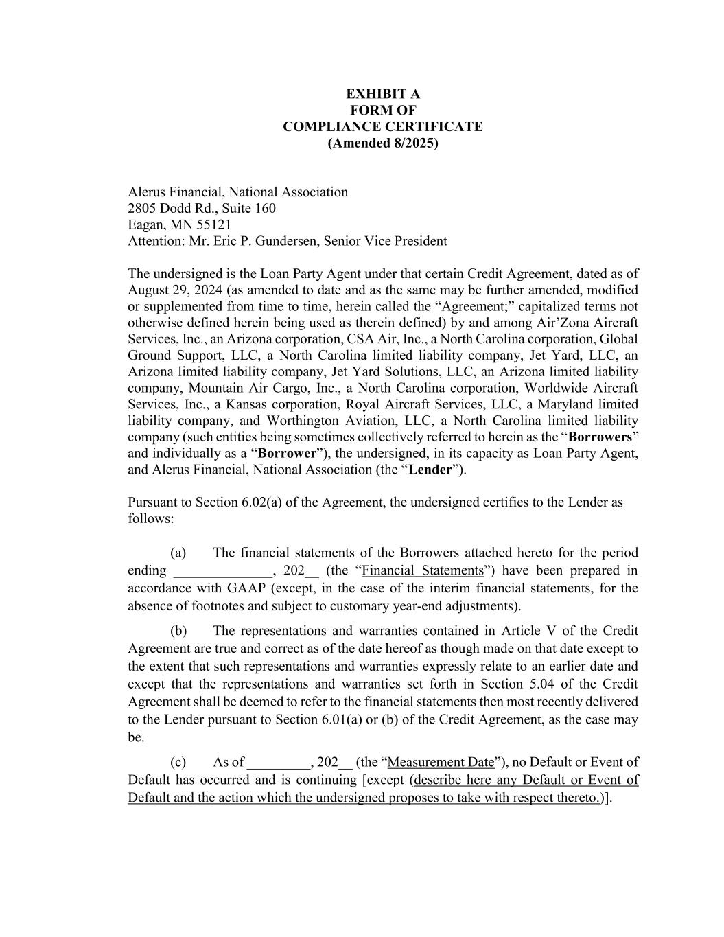 EXHIBIT A FORM OF COMPLIANCE CERTIFICATE (Amended 8/2025) Alerus Financial, National Association 2805 Dodd Rd., Suite 160 Eagan, MN 55121 Attention: Mr. Eric P. Gundersen, Senior Vice President The undersigned is the Loan Party Agent under that certain Credit Agreement, dated as of August 29, 2024 (as amended to date and as the same may be further amended, modified or supplemented from time to time, herein called the “Agreement;” capitalized terms not otherwise defined herein being used as therein defined) by and among Air’Zona Aircraft Services, Inc., an Arizona corporation, CSA Air, Inc., a North Carolina corporation, Global Ground Support, LLC, a North Carolina limited liability company, Jet Yard, LLC, an Arizona limited liability company, Jet Yard Solutions, LLC, an Arizona limited liability company, Mountain Air Cargo, Inc., a North Carolina corporation, Worldwide Aircraft Services, Inc., a Kansas corporation, Royal Aircraft Services, LLC, a Maryland limited liability company, and Worthington Aviation, LLC, a North Carolina limited liability company (such entities being sometimes collectively referred to herein as the “Borrowers” and individually as a “Borrower”), the undersigned, in its capacity as Loan Party Agent, and Alerus Financial, National Association (the “Lender”). Pursuant to Section 6.02(a) of the Agreement, the undersigned certifies to the Lender as follows: (a) The financial statements of the Borrowers attached hereto for the period ending ______________, 202__ (the “Financial Statements”) have been prepared in accordance with GAAP (except, in the case of the interim financial statements, for the absence of footnotes and subject to customary year-end adjustments). (b) The representations and warranties contained in Article V of the Credit Agreement are true and correct as of the date hereof as though made on that date except to the extent that such representations and warranties expressly relate to an earlier date and except that the representations and warranties set forth in Section 5.04 of the Credit Agreement shall be deemed to refer to the financial statements then most recently delivered to the Lender pursuant to Section 6.01(a) or (b) of the Credit Agreement, as the case may be. (c) As of _________, 202__ (the “Measurement Date”), no Default or Event of Default has occurred and is continuing [except (describe here any Default or Event of Default and the action which the undersigned proposes to take with respect thereto.)].
