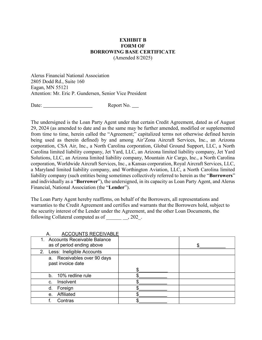 EXHIBIT B FORM OF BORROWING BASE CERTIFICATE (Amended 8/2025) Alerus Financial National Association 2805 Dodd Rd., Suite 160 Eagan, MN 55121 Attention: Mr. Eric P. Gundersen, Senior Vice President Date: Report No. The undersigned is the Loan Party Agent under that certain Credit Agreement, dated as of August 29, 2024 (as amended to date and as the same may be further amended, modified or supplemented from time to time, herein called the “Agreement;” capitalized terms not otherwise defined herein being used as therein defined) by and among Air’Zona Aircraft Services, Inc., an Arizona corporation, CSA Air, Inc., a North Carolina corporation, Global Ground Support, LLC, a North Carolina limited liability company, Jet Yard, LLC, an Arizona limited liability company, Jet Yard Solutions, LLC, an Arizona limited liability company, Mountain Air Cargo, Inc., a North Carolina corporation, Worldwide Aircraft Services, Inc., a Kansas corporation, Royal Aircraft Services, LLC, a Maryland limited liability company, and Worthington Aviation, LLC, a North Carolina limited liability company (such entities being sometimes collectively referred to herein as the “Borrowers” and individually as a “Borrower”), the undersigned, in its capacity as Loan Party Agent, and Alerus Financial, National Association (the “Lender”). The Loan Party Agent hereby reaffirms, on behalf of the Borrowers, all representations and warranties to the Credit Agreement and certifies and warrants that the Borrowers hold, subject to the security interest of the Lender under the Agreement, and the other Loan Documents, the following Collateral computed as of ______ __, 202_. A. ACCOUNTS RECEIVABLE 1. Accounts Receivable Balance as of period ending above $__________ 2. Less: Ineligible Accounts a. Receivables over 90 days past invoice date $___________ b. 10% redline rule $ c. Insolvent $ d. Foreign $ e. Affiliated $ f. Contras $