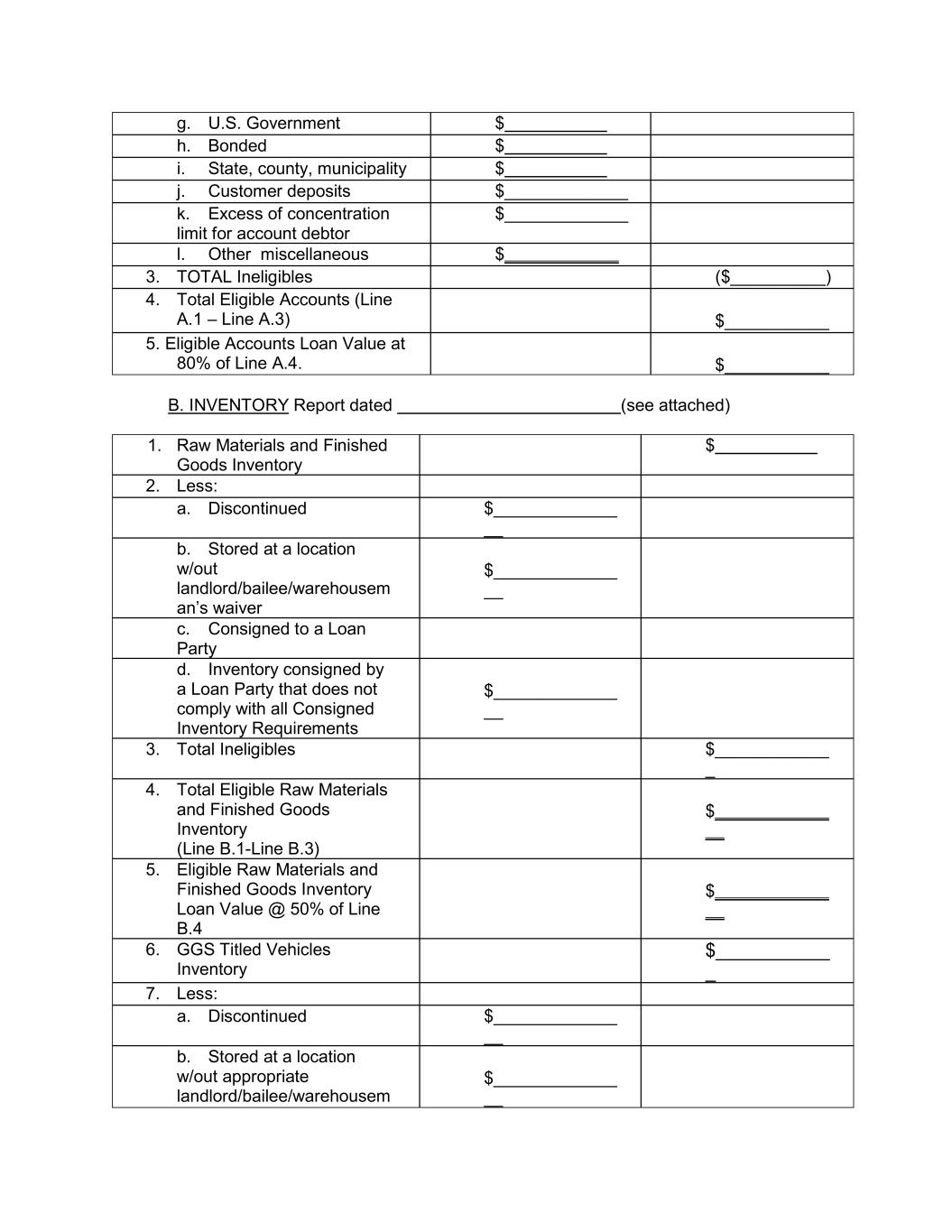 g. U.S. Government $ h. Bonded $ i. State, county, municipality $ j. Customer deposits $_____________ k. Excess of concentration limit for account debtor $_____________ l. Other miscellaneous $____________ 3. TOTAL Ineligibles ($__________) 4. Total Eligible Accounts (Line A.1 – Line A.3) $___________ 5. Eligible Accounts Loan Value at 80% of Line A.4. $___________ B. INVENTORY Report dated (see attached) 1. Raw Materials and Finished Goods Inventory $ 2. Less: a. Discontinued $_____________ __ b. Stored at a location w/out landlord/bailee/warehousem an’s waiver $_____________ __ c. Consigned to a Loan Party d. Inventory consigned by a Loan Party that does not comply with all Consigned Inventory Requirements $_____________ __ 3. Total Ineligibles $____________ _ 4. Total Eligible Raw Materials and Finished Goods Inventory (Line B.1-Line B.3) $____________ __ 5. Eligible Raw Materials and Finished Goods Inventory Loan Value @ 50% of Line B.4 $____________ __ 6. GGS Titled Vehicles Inventory $___________ _ 7. Less: a. Discontinued $_____________ __ b. Stored at a location w/out appropriate landlord/bailee/warehousem $_____________ __