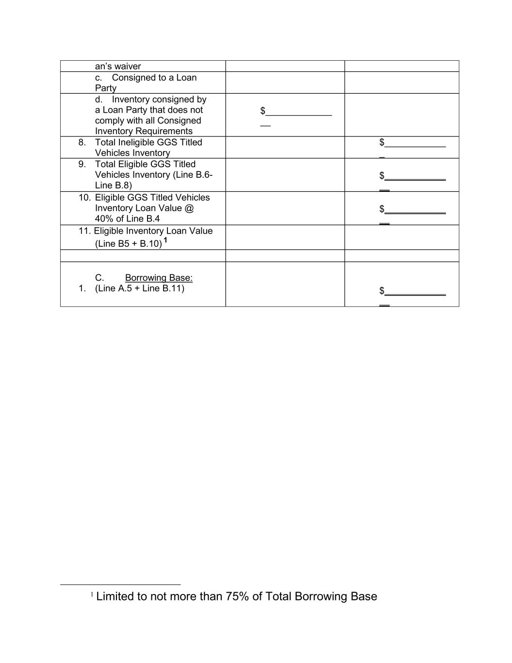 an’s waiver c. Consigned to a Loan Party d. Inventory consigned by a Loan Party that does not comply with all Consigned Inventory Requirements $_____________ __ 8. Total Ineligible GGS Titled Vehicles Inventory $____________ _ 9. Total Eligible GGS Titled Vehicles Inventory (Line B.6- Line B.8) $____________ __ 10. Eligible GGS Titled Vehicles Inventory Loan Value @ 40% of Line B.4 $____________ __ 11. Eligible Inventory Loan Value (Line B5 + B.10) 1 C. Borrowing Base: 1. (Line A.5 + Line B.11) $____________ __ 1 Limited to not more than 75% of Total Borrowing Base