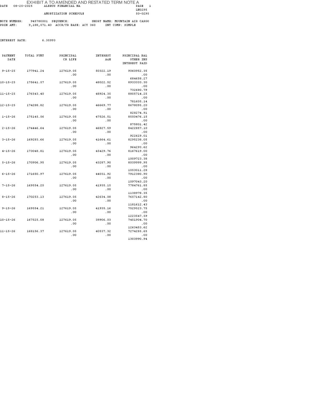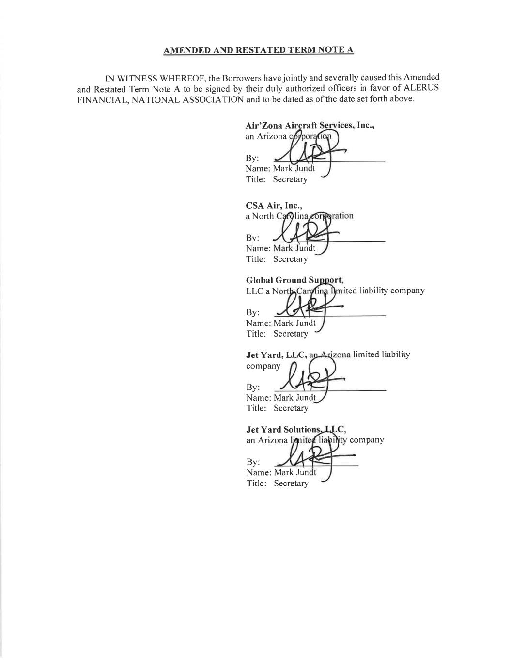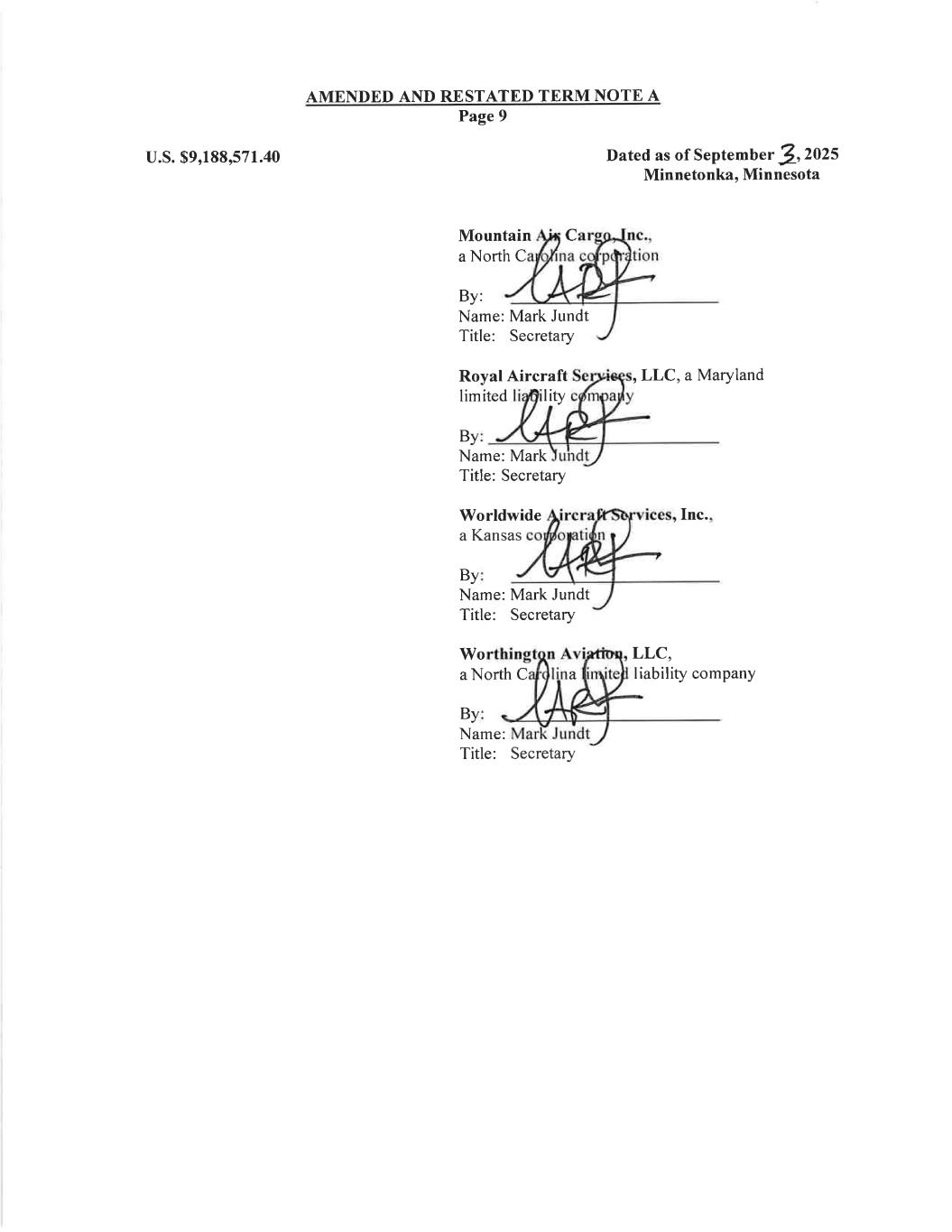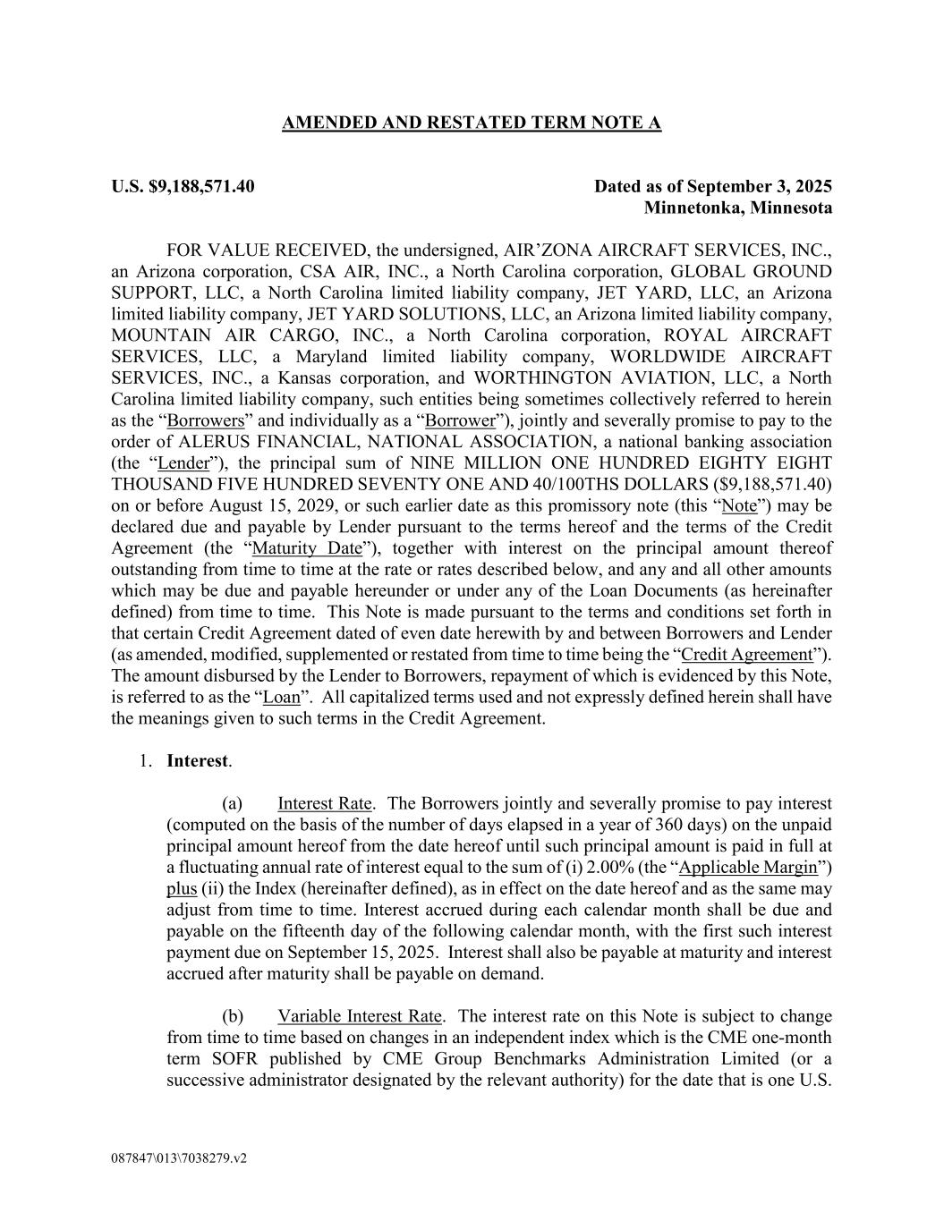 087847\013\7038279.v2 AMENDED AND RESTATED TERM NOTE A U.S. $9,188,571.40 Dated as of September 3, 2025 Minnetonka, Minnesota FOR VALUE RECEIVED, the undersigned, AIR’ZONA AIRCRAFT SERVICES, INC., an Arizona corporation, CSA AIR, INC., a North Carolina corporation, GLOBAL GROUND SUPPORT, LLC, a North Carolina limited liability company, JET YARD, LLC, an Arizona limited liability company, JET YARD SOLUTIONS, LLC, an Arizona limited liability company, MOUNTAIN AIR CARGO, INC., a North Carolina corporation, ROYAL AIRCRAFT SERVICES, LLC, a Maryland limited liability company, WORLDWIDE AIRCRAFT SERVICES, INC., a Kansas corporation, and WORTHINGTON AVIATION, LLC, a North Carolina limited liability company, such entities being sometimes collectively referred to herein as the “Borrowers” and individually as a “Borrower”), jointly and severally promise to pay to the order of ALERUS FINANCIAL, NATIONAL ASSOCIATION, a national banking association (the “Lender”), the principal sum of NINE MILLION ONE HUNDRED EIGHTY EIGHT THOUSAND FIVE HUNDRED SEVENTY ONE AND 40/100THS DOLLARS ($9,188,571.40) on or before August 15, 2029, or such earlier date as this promissory note (this “Note”) may be declared due and payable by Lender pursuant to the terms hereof and the terms of the Credit Agreement (the “Maturity Date”), together with interest on the principal amount thereof outstanding from time to time at the rate or rates described below, and any and all other amounts which may be due and payable hereunder or under any of the Loan Documents (as hereinafter defined) from time to time. This Note is made pursuant to the terms and conditions set forth in that certain Credit Agreement dated of even date herewith by and between Borrowers and Lender (as amended, modified, supplemented or restated from time to time being the “Credit Agreement”). The amount disbursed by the Lender to Borrowers, repayment of which is evidenced by this Note, is referred to as the “Loan”. All capitalized terms used and not expressly defined herein shall have the meanings given to such terms in the Credit Agreement. 1. Interest. (a) Interest Rate. The Borrowers jointly and severally promise to pay interest (computed on the basis of the number of days elapsed in a year of 360 days) on the unpaid principal amount hereof from the date hereof until such principal amount is paid in full at a fluctuating annual rate of interest equal to the sum of (i) 2.00% (the “Applicable Margin”) plus (ii) the Index (hereinafter defined), as in effect on the date hereof and as the same may adjust from time to time. Interest accrued during each calendar month shall be due and payable on the fifteenth day of the following calendar month, with the first such interest payment due on September 15, 2025. Interest shall also be payable at maturity and interest accrued after maturity shall be payable on demand. (b) Variable Interest Rate. The interest rate on this Note is subject to change from time to time based on changes in an independent index which is the CME one-month term SOFR published by CME Group Benchmarks Administration Limited (or a successive administrator designated by the relevant authority) for the date that is one U.S.