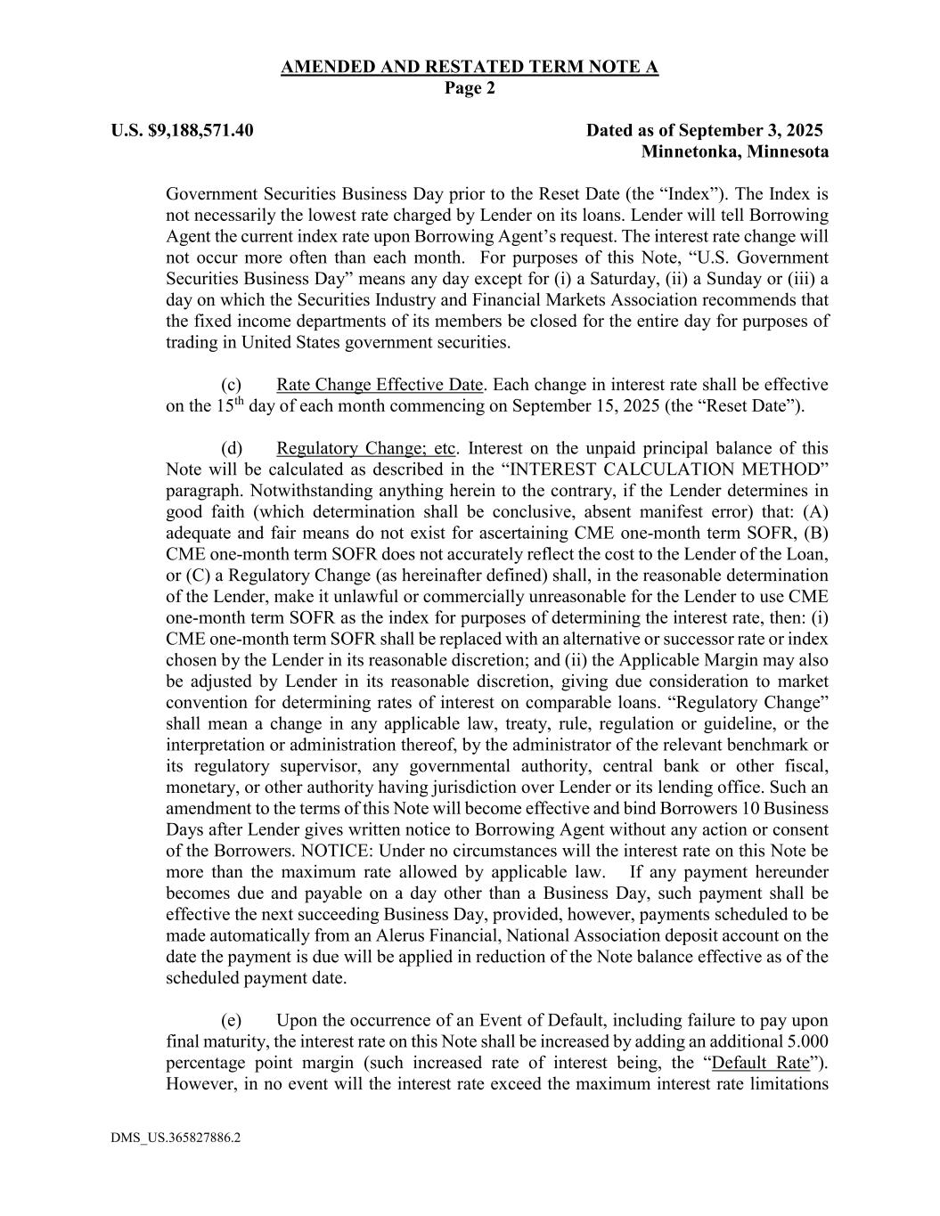AMENDED AND RESTATED TERM NOTE A Page 2 U.S. $9,188,571.40 Dated as of September 3, 2025 Minnetonka, Minnesota DMS_US.365827886.2 Government Securities Business Day prior to the Reset Date (the “Index”). The Index is not necessarily the lowest rate charged by Lender on its loans. Lender will tell Borrowing Agent the current index rate upon Borrowing Agent’s request. The interest rate change will not occur more often than each month. For purposes of this Note, “U.S. Government Securities Business Day” means any day except for (i) a Saturday, (ii) a Sunday or (iii) a day on which the Securities Industry and Financial Markets Association recommends that the fixed income departments of its members be closed for the entire day for purposes of trading in United States government securities. (c) Rate Change Effective Date. Each change in interest rate shall be effective on the 15th day of each month commencing on September 15, 2025 (the “Reset Date”). (d) Regulatory Change; etc. Interest on the unpaid principal balance of this Note will be calculated as described in the “INTEREST CALCULATION METHOD” paragraph. Notwithstanding anything herein to the contrary, if the Lender determines in good faith (which determination shall be conclusive, absent manifest error) that: (A) adequate and fair means do not exist for ascertaining CME one-month term SOFR, (B) CME one-month term SOFR does not accurately reflect the cost to the Lender of the Loan, or (C) a Regulatory Change (as hereinafter defined) shall, in the reasonable determination of the Lender, make it unlawful or commercially unreasonable for the Lender to use CME one-month term SOFR as the index for purposes of determining the interest rate, then: (i) CME one-month term SOFR shall be replaced with an alternative or successor rate or index chosen by the Lender in its reasonable discretion; and (ii) the Applicable Margin may also be adjusted by Lender in its reasonable discretion, giving due consideration to market convention for determining rates of interest on comparable loans. “Regulatory Change” shall mean a change in any applicable law, treaty, rule, regulation or guideline, or the interpretation or administration thereof, by the administrator of the relevant benchmark or its regulatory supervisor, any governmental authority, central bank or other fiscal, monetary, or other authority having jurisdiction over Lender or its lending office. Such an amendment to the terms of this Note will become effective and bind Borrowers 10 Business Days after Lender gives written notice to Borrowing Agent without any action or consent of the Borrowers. NOTICE: Under no circumstances will the interest rate on this Note be more than the maximum rate allowed by applicable law. If any payment hereunder becomes due and payable on a day other than a Business Day, such payment shall be effective the next succeeding Business Day, provided, however, payments scheduled to be made automatically from an Alerus Financial, National Association deposit account on the date the payment is due will be applied in reduction of the Note balance effective as of the scheduled payment date. (e) Upon the occurrence of an Event of Default, including failure to pay upon final maturity, the interest rate on this Note shall be increased by adding an additional 5.000 percentage point margin (such increased rate of interest being, the “Default Rate”). However, in no event will the interest rate exceed the maximum interest rate limitations
