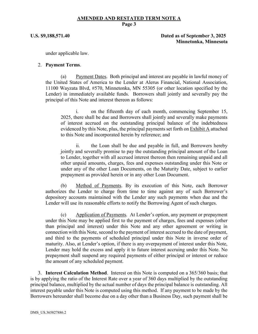 AMENDED AND RESTATED TERM NOTE A Page 3 U.S. $9,188,571.40 Dated as of September 3, 2025 Minnetonka, Minnesota DMS_US.365827886.2 under applicable law. 2. Payment Terms. (a) Payment Dates. Both principal and interest are payable in lawful money of the United States of America to the Lender at Alerus Financial, National Association, 11100 Wayzata Blvd, #570, Minnetonka, MN 55305 (or other location specified by the Lender) in immediately available funds. Borrowers shall jointly and severally pay the principal of this Note and interest thereon as follows: i. on the fifteenth day of each month, commencing September 15, 2025, there shall be due and Borrowers shall jointly and severally make payments of interest accrued on the outstanding principal balance of the indebtedness evidenced by this Note, plus, the principal payments set forth on Exhibit A attached to this Note and incorporated herein by reference; and ii. the Loan shall be due and payable in full, and Borrowers hereby jointly and severally promise to pay the outstanding principal amount of the Loan to Lender, together with all accrued interest thereon then remaining unpaid and all other unpaid amounts, charges, fees and expenses outstanding under this Note or under any of the other Loan Documents, on the Maturity Date, subject to earlier prepayment as provided herein or in any other Loan Document. (b) Method of Payments. By its execution of this Note, each Borrower authorizes the Lender to charge from time to time against any of such Borrower’s depository accounts maintained with the Lender any such payments when due and the Lender will use its reasonable efforts to notify the Borrowing Agent of such charges. (c) Application of Payments. At Lender’s option, any payment or prepayment under this Note may be applied first to the payment of charges, fees and expenses (other than principal and interest) under this Note and any other agreement or writing in connection with this Note, second to the payment of interest accrued to the date of payment, and third to the payments of scheduled principal under this Note in inverse order of maturity. Also, at Lender’s option, if there is any overpayment of interest under this Note, Lender may hold the excess and apply it to future interest accruing under this Note. No prepayment shall suspend any required payments of either principal or interest or reduce the amount of any scheduled payment. 3. Interest Calculation Method. Interest on this Note is computed on a 365/360 basis; that is by applying the ratio of the Interest Rate over a year of 360 days multiplied by the outstanding principal balance, multiplied by the actual number of days the principal balance is outstanding. All interest payable under this Note is computed using this method. If any payment to be made by the Borrowers hereunder shall become due on a day other than a Business Day, such payment shall be