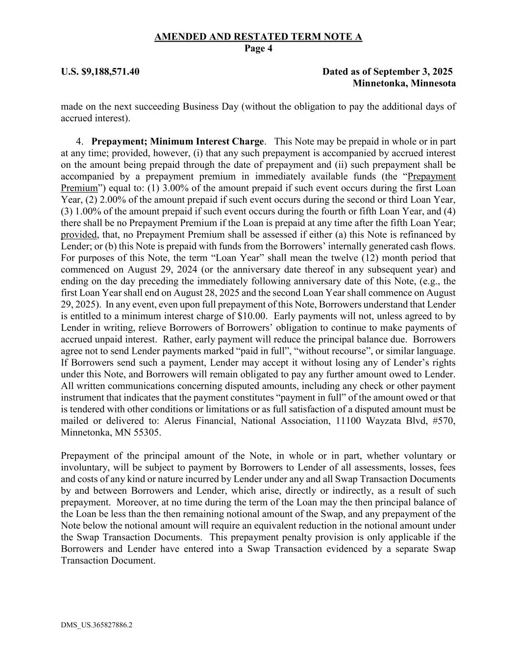 AMENDED AND RESTATED TERM NOTE A Page 4 U.S. $9,188,571.40 Dated as of September 3, 2025 Minnetonka, Minnesota DMS_US.365827886.2 made on the next succeeding Business Day (without the obligation to pay the additional days of accrued interest). 4. Prepayment; Minimum Interest Charge. This Note may be prepaid in whole or in part at any time; provided, however, (i) that any such prepayment is accompanied by accrued interest on the amount being prepaid through the date of prepayment and (ii) such prepayment shall be accompanied by a prepayment premium in immediately available funds (the “Prepayment Premium”) equal to: (1) 3.00% of the amount prepaid if such event occurs during the first Loan Year, (2) 2.00% of the amount prepaid if such event occurs during the second or third Loan Year, (3) 1.00% of the amount prepaid if such event occurs during the fourth or fifth Loan Year, and (4) there shall be no Prepayment Premium if the Loan is prepaid at any time after the fifth Loan Year; provided, that, no Prepayment Premium shall be assessed if either (a) this Note is refinanced by Lender; or (b) this Note is prepaid with funds from the Borrowers’ internally generated cash flows. For purposes of this Note, the term “Loan Year” shall mean the twelve (12) month period that commenced on August 29, 2024 (or the anniversary date thereof in any subsequent year) and ending on the day preceding the immediately following anniversary date of this Note, (e.g., the first Loan Year shall end on August 28, 2025 and the second Loan Year shall commence on August 29, 2025). In any event, even upon full prepayment of this Note, Borrowers understand that Lender is entitled to a minimum interest charge of $10.00. Early payments will not, unless agreed to by Lender in writing, relieve Borrowers of Borrowers’ obligation to continue to make payments of accrued unpaid interest. Rather, early payment will reduce the principal balance due. Borrowers agree not to send Lender payments marked “paid in full”, “without recourse”, or similar language. If Borrowers send such a payment, Lender may accept it without losing any of Lender’s rights under this Note, and Borrowers will remain obligated to pay any further amount owed to Lender. All written communications concerning disputed amounts, including any check or other payment instrument that indicates that the payment constitutes “payment in full” of the amount owed or that is tendered with other conditions or limitations or as full satisfaction of a disputed amount must be mailed or delivered to: Alerus Financial, National Association, 11100 Wayzata Blvd, #570, Minnetonka, MN 55305. Prepayment of the principal amount of the Note, in whole or in part, whether voluntary or involuntary, will be subject to payment by Borrowers to Lender of all assessments, losses, fees and costs of any kind or nature incurred by Lender under any and all Swap Transaction Documents by and between Borrowers and Lender, which arise, directly or indirectly, as a result of such prepayment. Moreover, at no time during the term of the Loan may the then principal balance of the Loan be less than the then remaining notional amount of the Swap, and any prepayment of the Note below the notional amount will require an equivalent reduction in the notional amount under the Swap Transaction Documents. This prepayment penalty provision is only applicable if the Borrowers and Lender have entered into a Swap Transaction evidenced by a separate Swap Transaction Document.