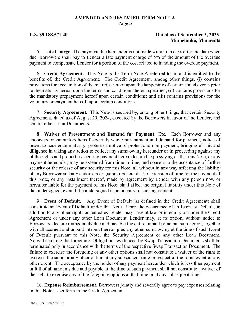 AMENDED AND RESTATED TERM NOTE A Page 5 U.S. $9,188,571.40 Dated as of September 3, 2025 Minnetonka, Minnesota DMS_US.365827886.2 5. Late Charge. If a payment due hereunder is not made within ten days after the date when due, Borrowers shall pay to Lender a late payment charge of 5% of the amount of the overdue payment to compensate Lender for a portion of the cost related to handling the overdue payment. 6. Credit Agreement. This Note is the Term Note A referred to in, and is entitled to the benefits of, the Credit Agreement. The Credit Agreement, among other things, (i) contains provisions for acceleration of the maturity hereof upon the happening of certain stated events prior to the maturity hereof upon the terms and conditions therein specified; (ii) contains provisions for the mandatory prepayment hereof upon certain conditions; and (iii) contains provisions for the voluntary prepayment hereof, upon certain conditions. 7. Security Agreement. This Note is secured by, among other things, that certain Security Agreement, dated as of August 29, 2024, executed by the Borrowers in favor of the Lender, and certain other Loan Documents. 8. Waiver of Presentment and Demand for Payment; Etc. Each Borrower and any endorsers or guarantors hereof severally waive presentment and demand for payment, notice of intent to accelerate maturity, protest or notice of protest and non-payment, bringing of suit and diligence in taking any action to collect any sums owing hereunder or in proceeding against any of the rights and properties securing payment hereunder, and expressly agree that this Note, or any payment hereunder, may be extended from time to time, and consent to the acceptance of further security or the release of any security for this Note, all without in any way affecting the liability of any Borrower and any endorsers or guarantors hereof. No extension of time for the payment of this Note, or any installment thereof, made by agreement by Lender with any person now or hereafter liable for the payment of this Note, shall affect the original liability under this Note of the undersigned, even if the undersigned is not a party to such agreement. 9. Event of Default. Any Event of Default (as defined in the Credit Agreement) shall constitute an Event of Default under this Note. Upon the occurrence of an Event of Default, in addition to any other rights or remedies Lender may have at law or in equity or under the Credit Agreement or under any other Loan Document, Lender may, at its option, without notice to Borrowers, declare immediately due and payable the entire unpaid principal sum hereof, together with all accrued and unpaid interest thereon plus any other sums owing at the time of such Event of Default pursuant to this Note, the Security Agreement or any other Loan Document. Notwithstanding the foregoing, Obligations evidenced by Swap Transaction Documents shall be terminated only in accordance with the terms of the respective Swap Transaction Document. The failure to exercise the foregoing or any other options shall not constitute a waiver of the right to exercise the same or any other option at any subsequent time in respect of the same event or any other event. The acceptance by the holder of any payment hereunder which is less than payment in full of all amounts due and payable at the time of such payment shall not constitute a waiver of the right to exercise any of the foregoing options at that time or at any subsequent time. 10. Expense Reimbursement. Borrowers jointly and severally agree to pay expenses relating to this Note as set forth in the Credit Agreement.