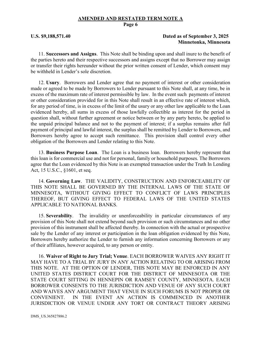 AMENDED AND RESTATED TERM NOTE A Page 6 U.S. $9,188,571.40 Dated as of September 3, 2025 Minnetonka, Minnesota DMS_US.365827886.2 11. Successors and Assigns. This Note shall be binding upon and shall inure to the benefit of the parties hereto and their respective successors and assigns except that no Borrower may assign or transfer their rights hereunder without the prior written consent of Lender, which consent may be withheld in Lender’s sole discretion. 12. Usury. Borrowers and Lender agree that no payment of interest or other consideration made or agreed to be made by Borrowers to Lender pursuant to this Note shall, at any time, be in excess of the maximum rate of interest permissible by law. In the event such payments of interest or other consideration provided for in this Note shall result in an effective rate of interest which, for any period of time, is in excess of the limit of the usury or any other law applicable to the Loan evidenced hereby, all sums in excess of those lawfully collectible as interest for the period in question shall, without further agreement or notice between or by any party hereto, be applied to the unpaid principal balance and not to the payment of interest; if a surplus remains after full payment of principal and lawful interest, the surplus shall be remitted by Lender to Borrowers, and Borrowers hereby agree to accept such remittance. This provision shall control every other obligation of the Borrowers and Lender relating to this Note. 13. Business Purpose Loan. The Loan is a business loan. Borrowers hereby represent that this loan is for commercial use and not for personal, family or household purposes. The Borrowers agree that the Loan evidenced by this Note is an exempted transaction under the Truth In Lending Act, 15 U.S.C., §1601, et seq. 14. Governing Law. THE VALIDITY, CONSTRUCTION AND ENFORCEABILITY OF THIS NOTE SHALL BE GOVERNED BY THE INTERNAL LAWS OF THE STATE OF MINNESOTA, WITHOUT GIVING EFFECT TO CONFLICT OF LAWS PRINCIPLES THEREOF, BUT GIVING EFFECT TO FEDERAL LAWS OF THE UNITED STATES APPLICABLE TO NATIONAL BANKS. 15. Severability. The invalidity or unenforceability in particular circumstances of any provision of this Note shall not extend beyond such provision or such circumstances and no other provision of this instrument shall be affected thereby. In connection with the actual or prospective sale by the Lender of any interest or participation in the loan obligation evidenced by this Note, Borrowers hereby authorize the Lender to furnish any information concerning Borrowers or any of their affiliates, however acquired, to any person or entity. 16. Waiver of Right to Jury Trial; Venue. EACH BORROWER WAIVES ANY RIGHT IT MAY HAVE TO A TRIAL BY JURY IN ANY ACTION RELATING TO OR ARISING FROM THIS NOTE. AT THE OPTION OF LENDER, THIS NOTE MAY BE ENFORCED IN ANY UNITED STATES DISTRICT COURT FOR THE DISTRICT OF MINNESOTA OR THE STATE COURT SITTING IN HENNEPIN OR RAMSEY COUNTY, MINNESOTA. EACH BORROWER CONSENTS TO THE JURISDICTION AND VENUE OF ANY SUCH COURT AND WAIVES ANY ARGUMENT THAT VENUE IN SUCH FORUMS IS NOT PROPER OR CONVENIENT. IN THE EVENT AN ACTION IS COMMENCED IN ANOTHER JURISDICTION OR VENUE UNDER ANY TORT OR CONTRACT THEORY ARISING