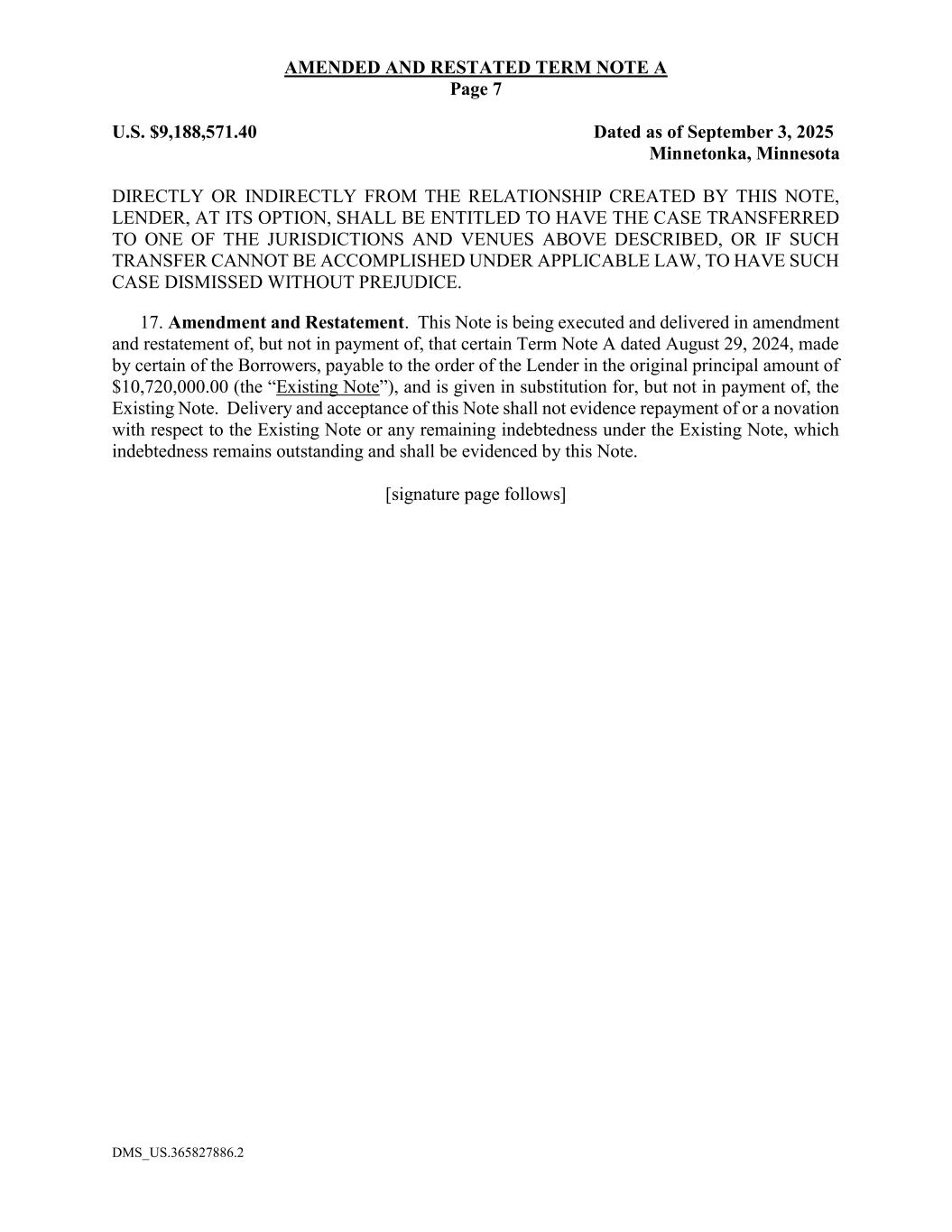 AMENDED AND RESTATED TERM NOTE A Page 7 U.S. $9,188,571.40 Dated as of September 3, 2025 Minnetonka, Minnesota DMS_US.365827886.2 DIRECTLY OR INDIRECTLY FROM THE RELATIONSHIP CREATED BY THIS NOTE, LENDER, AT ITS OPTION, SHALL BE ENTITLED TO HAVE THE CASE TRANSFERRED TO ONE OF THE JURISDICTIONS AND VENUES ABOVE DESCRIBED, OR IF SUCH TRANSFER CANNOT BE ACCOMPLISHED UNDER APPLICABLE LAW, TO HAVE SUCH CASE DISMISSED WITHOUT PREJUDICE. 17. Amendment and Restatement. This Note is being executed and delivered in amendment and restatement of, but not in payment of, that certain Term Note A dated August 29, 2024, made by certain of the Borrowers, payable to the order of the Lender in the original principal amount of $10,720,000.00 (the “Existing Note”), and is given in substitution for, but not in payment of, the Existing Note. Delivery and acceptance of this Note shall not evidence repayment of or a novation with respect to the Existing Note or any remaining indebtedness under the Existing Note, which indebtedness remains outstanding and shall be evidenced by this Note. [signature page follows]