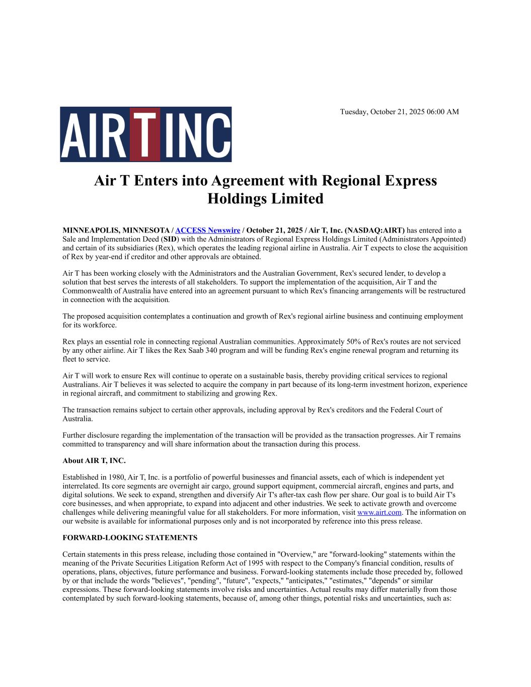 Tuesday, October 21, 2025 06:00 AM Air T Enters into Agreement with Regional Express Holdings Limited MINNEAPOLIS, MINNESOTA / ACCESS Newswire / October 21, 2025 / Air T, Inc. (NASDAQ:AIRT) has entered into a Sale and Implementation Deed (SID) with the Administrators of Regional Express Holdings Limited (Administrators Appointed) and certain of its subsidiaries (Rex), which operates the leading regional airline in Australia. Air T expects to close the acquisition of Rex by year-end if creditor and other approvals are obtained. Air T has been working closely with the Administrators and the Australian Government, Rex's secured lender, to develop a solution that best serves the interests of all stakeholders. To support the implementation of the acquisition, Air T and the Commonwealth of Australia have entered into an agreement pursuant to which Rex's financing arrangements will be restructured in connection with the acquisition. The proposed acquisition contemplates a continuation and growth of Rex's regional airline business and continuing employment for its workforce. Rex plays an essential role in connecting regional Australian communities. Approximately 50% of Rex's routes are not serviced by any other airline. Air T likes the Rex Saab 340 program and will be funding Rex's engine renewal program and returning its fleet to service. Air T will work to ensure Rex will continue to operate on a sustainable basis, thereby providing critical services to regional Australians. Air T believes it was selected to acquire the company in part because of its long-term investment horizon, experience in regional aircraft, and commitment to stabilizing and growing Rex. The transaction remains subject to certain other approvals, including approval by Rex's creditors and the Federal Court of Australia. Further disclosure regarding the implementation of the transaction will be provided as the transaction progresses. Air T remains committed to transparency and will share information about the transaction during this process. About AIR T, INC. Established in 1980, Air T, Inc. is a portfolio of powerful businesses and financial assets, each of which is independent yet interrelated. Its core segments are overnight air cargo, ground support equipment, commercial aircraft, engines and parts, and digital solutions. We seek to expand, strengthen and diversify Air T's after-tax cash flow per share. Our goal is to build Air T's core businesses, and when appropriate, to expand into adjacent and other industries. We seek to activate growth and overcome challenges while delivering meaningful value for all stakeholders. For more information, visit www.airt.com. The information on our website is available for informational purposes only and is not incorporated by reference into this press release. FORWARD-LOOKING STATEMENTS Certain statements in this press release, including those contained in "Overview," are "forward-looking" statements within the meaning of the Private Securities Litigation Reform Act of 1995 with respect to the Company's financial condition, results of operations, plans, objectives, future performance and business. Forward-looking statements include those preceded by, followed by or that include the words "believes", "pending", "future", "expects," "anticipates," "estimates," "depends" or similar expressions. These forward-looking statements involve risks and uncertainties. Actual results may differ materially from those contemplated by such forward-looking statements, because of, among other things, potential risks and uncertainties, such as: