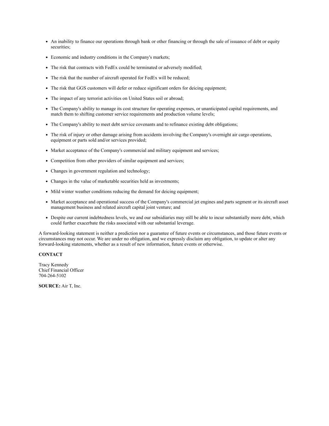 An inability to finance our operations through bank or other financing or through the sale of issuance of debt or equity securities; Economic and industry conditions in the Company's markets; The risk that contracts with FedEx could be terminated or adversely modified; The risk that the number of aircraft operated for FedEx will be reduced; The risk that GGS customers will defer or reduce significant orders for deicing equipment; The impact of any terrorist activities on United States soil or abroad; The Company's ability to manage its cost structure for operating expenses, or unanticipated capital requirements, and match them to shifting customer service requirements and production volume levels; The Company's ability to meet debt service covenants and to refinance existing debt obligations; The risk of injury or other damage arising from accidents involving the Company's overnight air cargo operations, equipment or parts sold and/or services provided; Market acceptance of the Company's commercial and military equipment and services; Competition from other providers of similar equipment and services; Changes in government regulation and technology; Changes in the value of marketable securities held as investments; Mild winter weather conditions reducing the demand for deicing equipment; Market acceptance and operational success of the Company's commercial jet engines and parts segment or its aircraft asset management business and related aircraft capital joint venture; and Despite our current indebtedness levels, we and our subsidiaries may still be able to incur substantially more debt, which could further exacerbate the risks associated with our substantial leverage. A forward-looking statement is neither a prediction nor a guarantee of future events or circumstances, and those future events or circumstances may not occur. We are under no obligation, and we expressly disclaim any obligation, to update or alter any forward-looking statements, whether as a result of new information, future events or otherwise. CONTACT Tracy Kennedy Chief Financial Officer 704-264-5102 SOURCE: Air T, Inc.