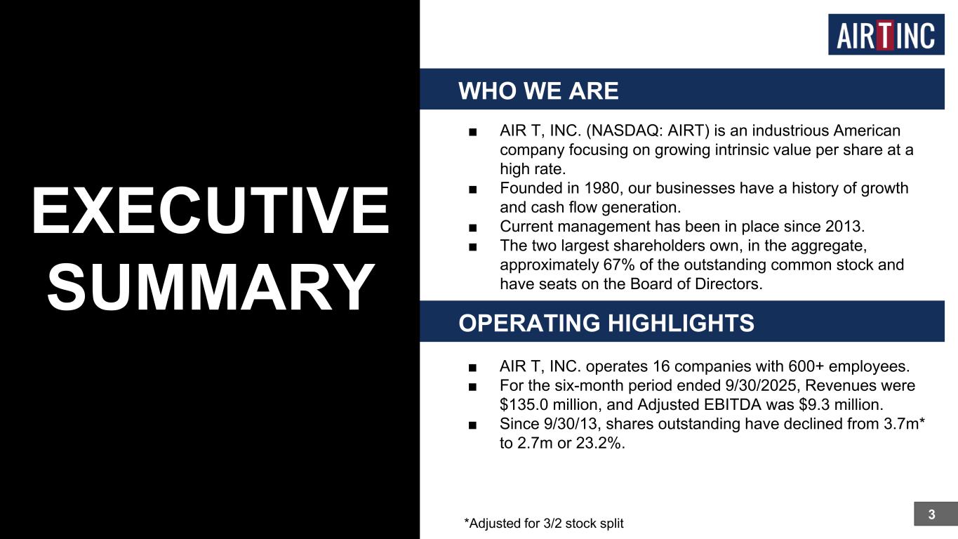 3 ■ AIR T, INC. (NASDAQ: AIRT) is an industrious American company focusing on growing intrinsic value per share at a high rate. ■ Founded in 1980, our businesses have a history of growth and cash flow generation. ■ Current management has been in place since 2013. ■ The two largest shareholders own, in the aggregate, approximately 67% of the outstanding common stock and have seats on the Board of Directors. WHO WE ARE OPERATING HIGHLIGHTS EXECUTIVE SUMMARY ■ AIR T, INC. operates 16 companies with 600+ employees. ■ For the six-month period ended 9/30/2025, Revenues were $135.0 million, and Adjusted EBITDA was $9.3 million. ■ Since 9/30/13, shares outstanding have declined from 3.7m* to 2.7m or 23.2%. *Adjusted for 3/2 stock split