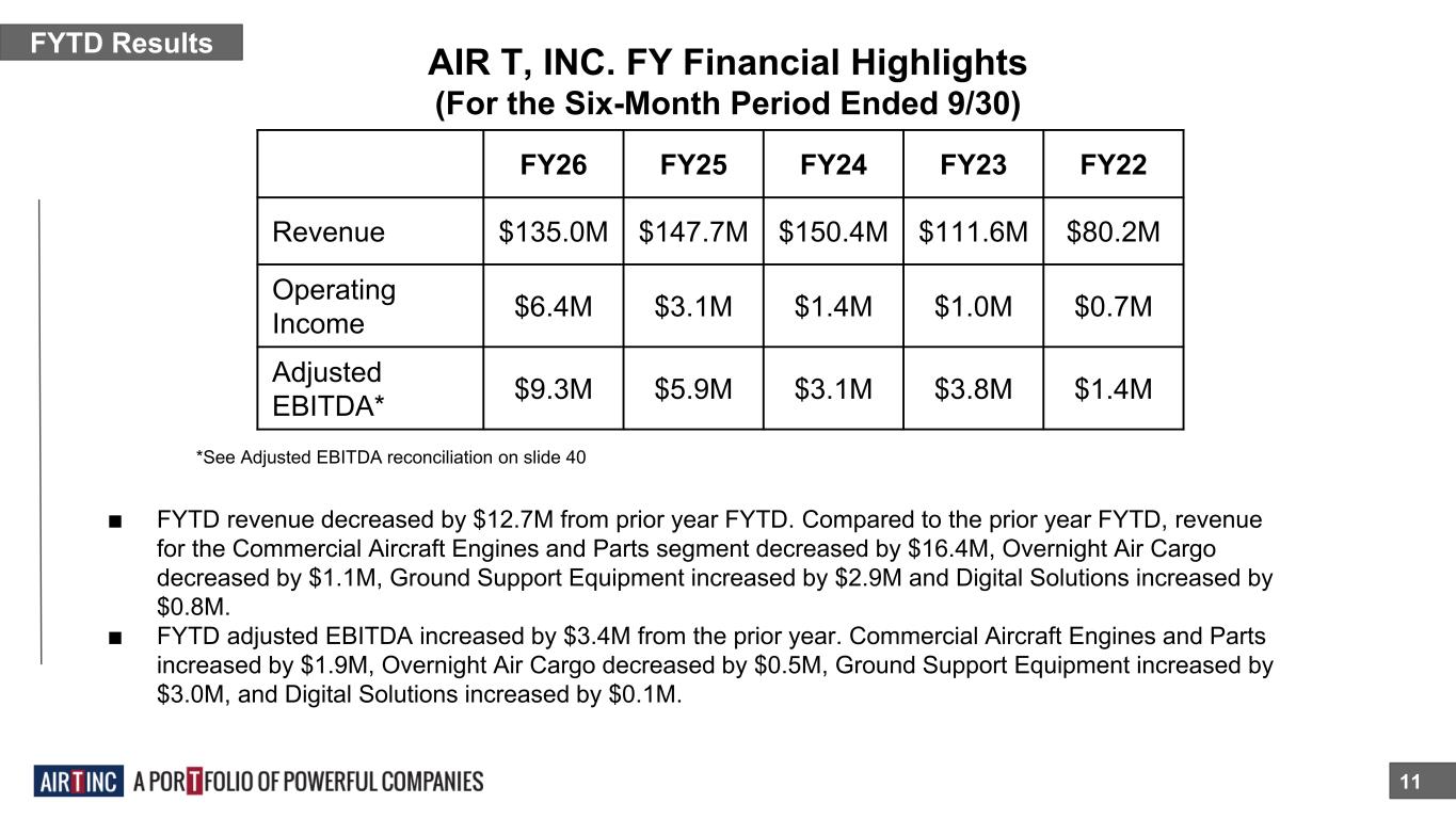 AIR T, INC. FY Financial Highlights (For the Twelve-Month Period Ended 3/31) 10 FY Results ■ FY25 saw a 2% revenue increase compared to FY24. This includes a $7.3M decrease in Commercial Aircraft Engines and Parts, driven by a lower supply of whole assets available to purchase for tear-down and resale. Overnight Air Cargo increased by $8.5M, mainly due to higher pass-through revenues and admin fees. A higher volume of deicers to commercial customers and increase in spare part sales increased Ground Support Equipment Segment by $1.8M. Digital solutions revenue increased by $1.5M primarily due to increased software subscriptions. ■ FY25 Adjusted EBITDA increased by $1.2M. Overnight Air Cargo decreased by $0.3M in the current fiscal year due to lower segment operating income. Commercial Aircraft Engines and Parts increased by $3.7M due to a higher profit margin on component sales. Ground Support Equipment segment decreased by $0.2M due to higher sales and Digital Solutions segment decreased by $0.4M due to higher personnel costs. 1 Includes addition of share-based compensation and severance expense adjustments to enhance comparability with current year’s presentation. FY25 FY24 FY23 FY22 FY21 Revenue $291.9M $286.8M $247.3M $177.1M $175.1M Operating Income $1.9M $1.3M ($4.4M) $8.8M ($9.2M) Adjusted EBITDA* $7.4M $6.2M1 $6.0M $11.4M ($1.3M) *See Adjusted EBITDA reconciliation on slide 39