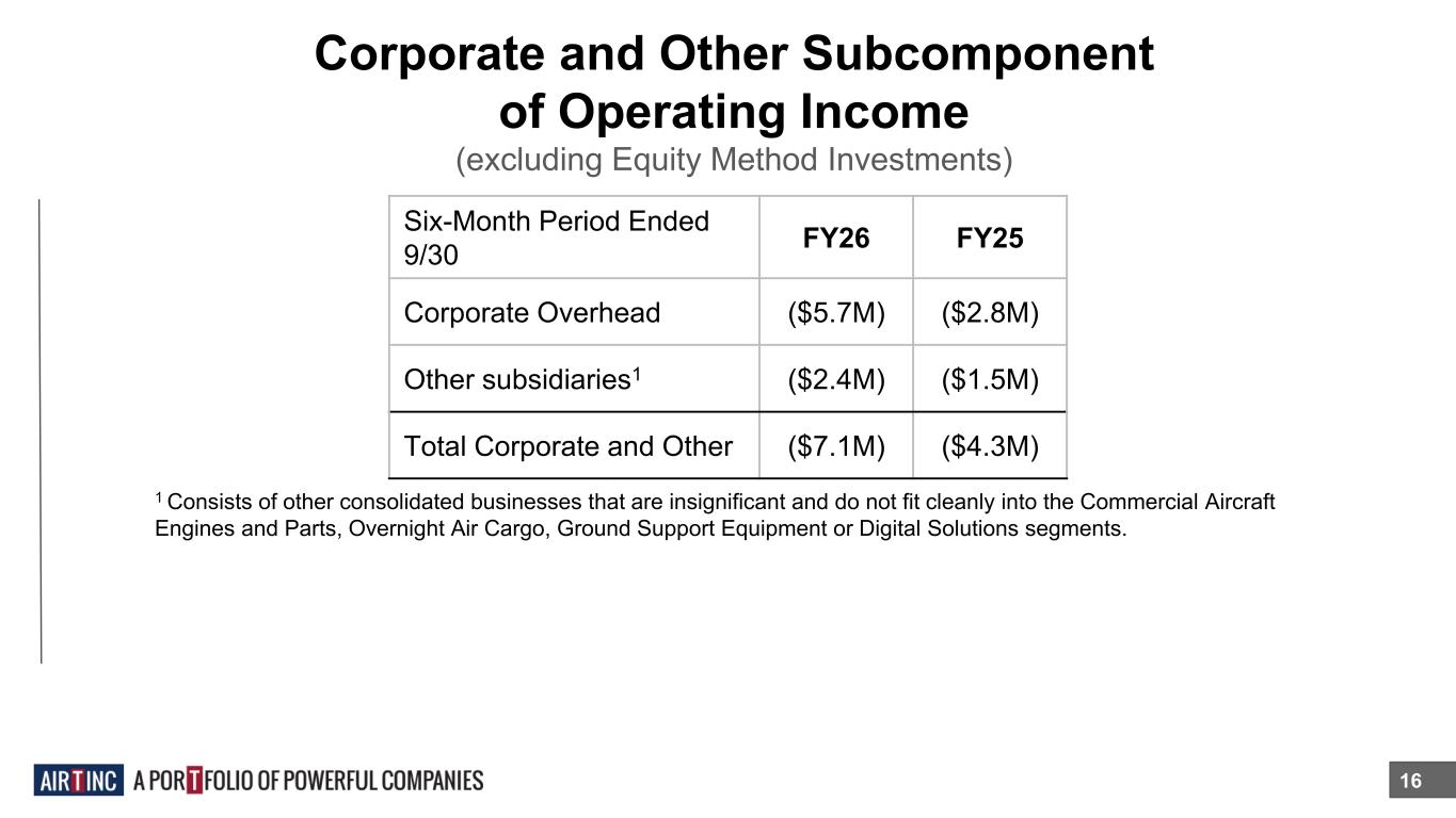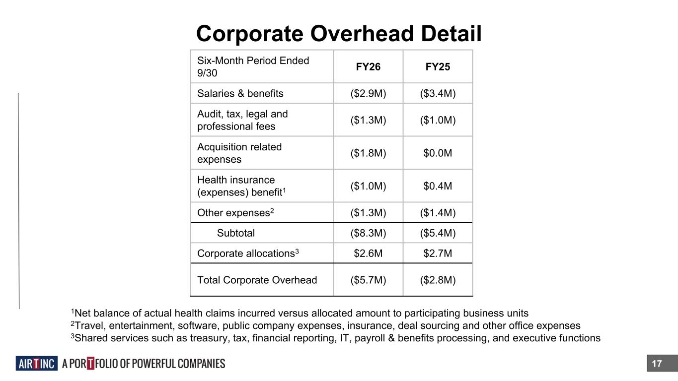 16 Six-Month Period Ended 9/30 FY26 FY25 Corporate Overhead ($5.7M) ($2.8M) Other subsidiaries1 ($2.4M) ($1.5M) Total Corporate and Other ($7.1M) ($4.3M) 1 Consists of other consolidated businesses that are insignificant and do not fit cleanly into the Commercial Aircraft Engines and Parts, Overnight Air Cargo, Ground Support Equipment or Digital Solutions segments. Corporate and Other Subcomponent of Operating Income (excluding Equity Method Investments)