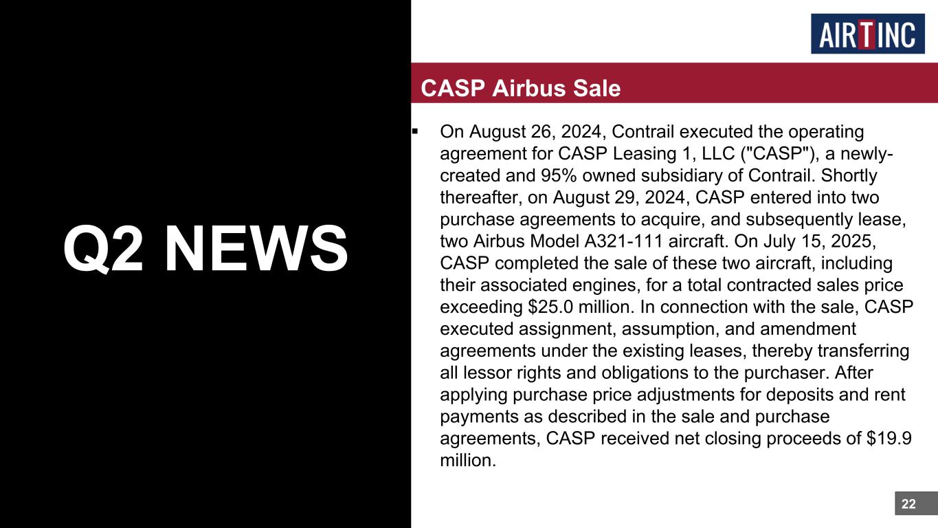 22 Q2 NEWS CASP Airbus Sale ▪ On August 26, 2024, Contrail executed the operating agreement for CASP Leasing 1, LLC ("CASP"), a newly- created and 95% owned subsidiary of Contrail. Shortly thereafter, on August 29, 2024, CASP entered into two purchase agreements to acquire, and subsequently lease, two Airbus Model A321-111 aircraft. On July 15, 2025, CASP completed the sale of these two aircraft, including their associated engines, for a total contracted sales price exceeding $25.0 million. In connection with the sale, CASP executed assignment, assumption, and amendment agreements under the existing leases, thereby transferring all lessor rights and obligations to the purchaser. After applying purchase price adjustments for deposits and rent payments as described in the sale and purchase agreements, CASP received net closing proceeds of $19.9 million.