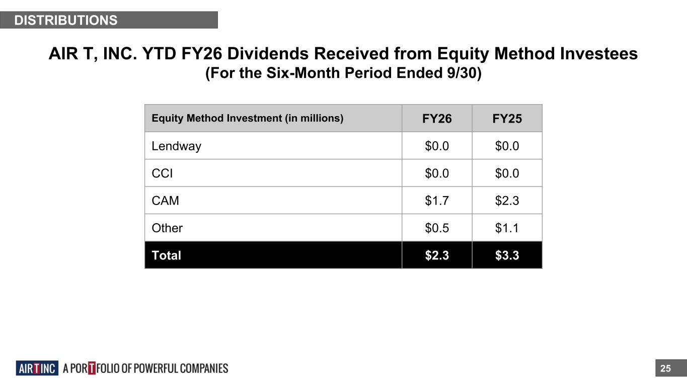 25 DISTRIBUTIONS Equity Method Investment (in millions) FY26 FY25 Lendway $0.0 $0.0 CCI $0.0 $0.0 CAM $1.7 $2.3 Other $0.5 $1.1 Total $2.3 $3.3 AIR T, INC. YTD FY26 Dividends Received from Equity Method Investees (For the Six-Month Period Ended 9/30)