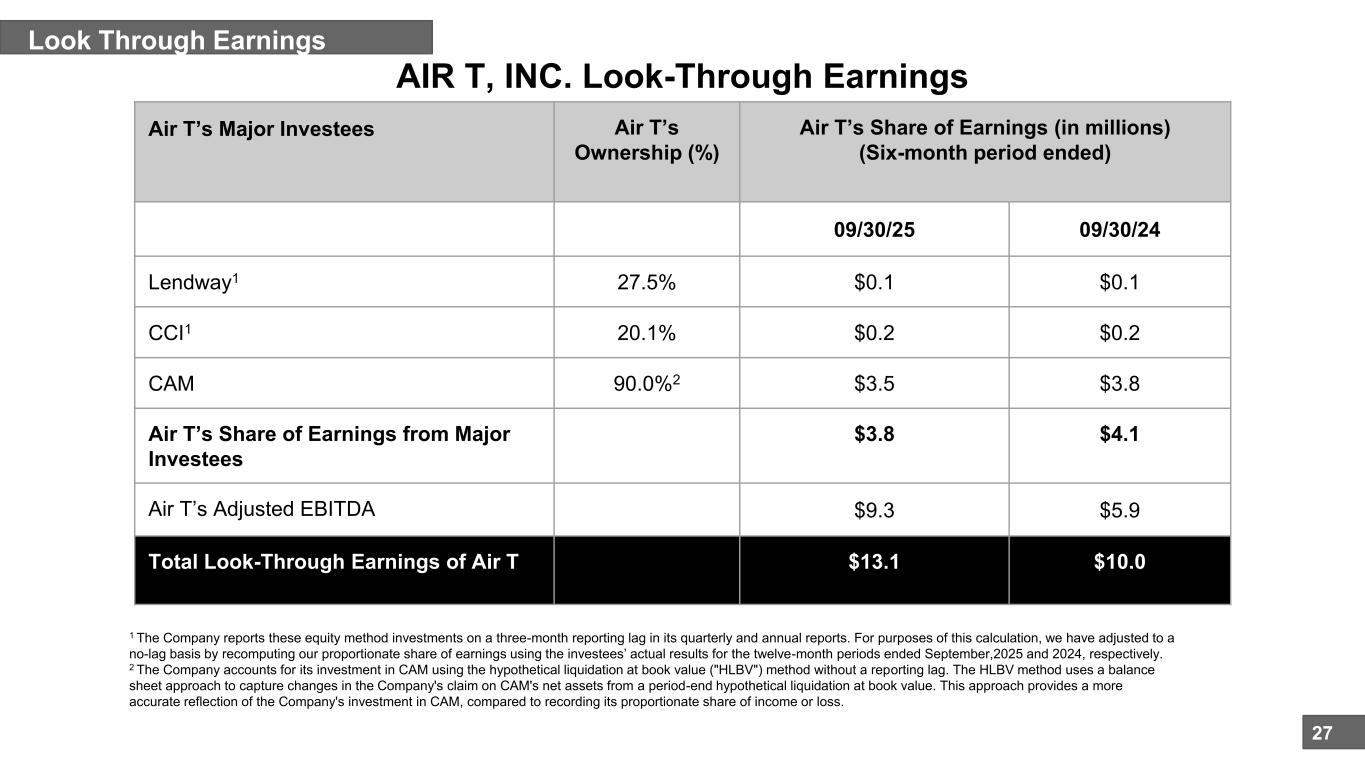 26 Look Through Earnings Air T’s Major Investees Air T’s Ownership (%) Air T’s Share of Earnings (in millions) (12-month period ended) 03/31/25 03/31/24 Lendway1 27.5% ($0.8) ($0.3) CCI1 20.1% $0.1 $1.3 CAM 90.0%2 $2.9 ($0.2) Air T’s Share of Earnings from Major Investees $2.2 $0.8 Air T’s Adjusted EBITDA $7.4 $5.6 Total Look-Through Earnings of Air T $9.6 $6.4 AIR T, INC. Look-Through Earnings 1 The Company reports these equity method investments on a three-month reporting lag in its quarterly and annual reports. For purposes of this calculation, we have adjusted to a no-lag basis by recomputing our proportionate share of earnings using the investees’ actual results for the twelve-month periods ended March 31,2025 and 2024, respectively. 2 The Company accounts for its investment in CAM using the hypothetical liquidation at book value ("HLBV") method without a reporting lag. The HLBV method uses a balance sheet approach to capture changes in the Company's claim on CAM's net assets from a period-end hypothetical liquidation at book value. This approach provides a more accurate reflection of the Company's investment in CAM, compared to recording its proportionate share of income or loss.