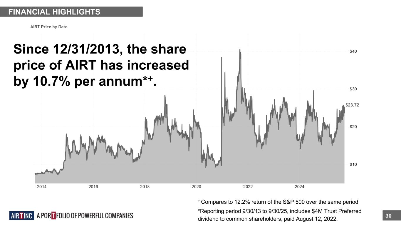 FINANCIAL HIGHLIGHTS 30 *Reporting period 9/30/13 to 9/30/25, includes $4M Trust Preferred dividend to common shareholders, paid August 12, 2022. + Compares to 12.2% return of the S&P 500 over the same period $23.72 Since 12/31/2013, the share price of AIRT has increased by 10.7% per annum*+.