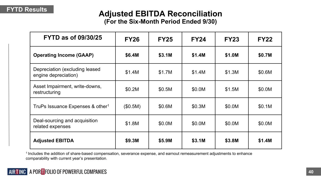 Adjusted EBITDA Reconciliation 39 FY Results *Includes one-time ERC credit of $9.1M (For the Twelve-Month Period Ended 3/31) FY25 FY24 FY23 FY22 FY21 Operating Income (GAAP) $1.9M $1.3M ($4.4M) $8.8M* ($9.2M) Depreciation (excluding leased engine depreciation) $3.0M $2.8M $2.5M $1.6M $1.2M Asset Impairment, write-downs, restructuring $1.5M $1.2M $7.8M $0.8M $6.6M TruPs Issuance Expenses & other1 $1.0M $0.9M $0.1M $0.3M $0.0M Adjusted EBITDA $7.4M $6.1M $6.0M $11.4M* ($1.3M) 1 Includes the addition of share-based compensation, severance expense and deal-sourcing expense adjustments to enhance comparability with current year’s presentation.
