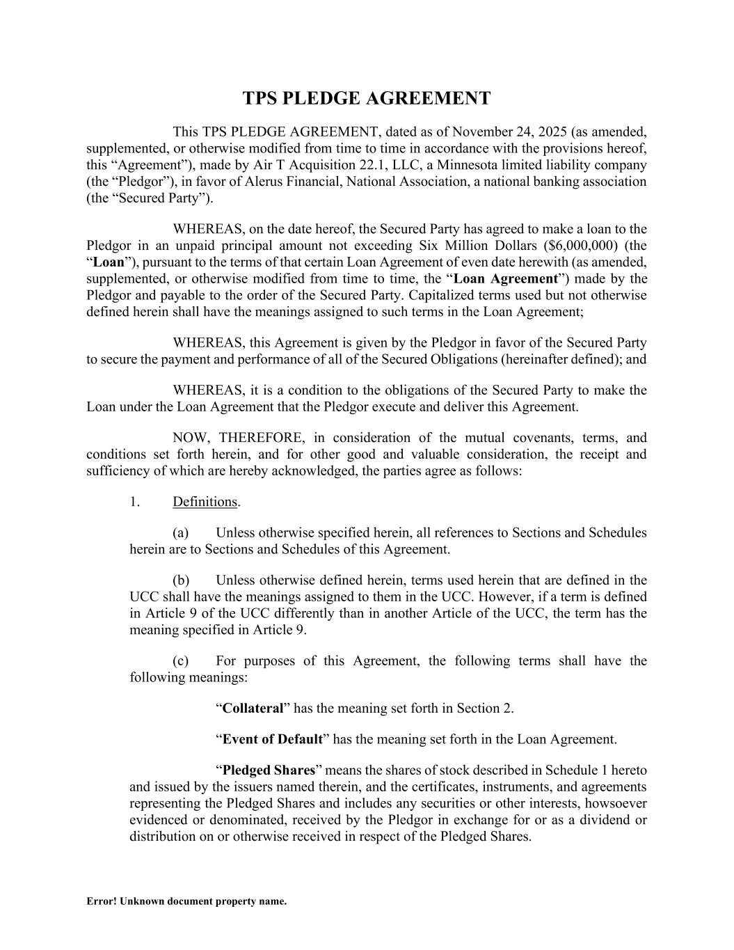 Error! Unknown document property name. TPS PLEDGE AGREEMENT This TPS PLEDGE AGREEMENT, dated as of November 24, 2025 (as amended, supplemented, or otherwise modified from time to time in accordance with the provisions hereof, this “Agreement”), made by Air T Acquisition 22.1, LLC, a Minnesota limited liability company (the “Pledgor”), in favor of Alerus Financial, National Association, a national banking association (the “Secured Party”). WHEREAS, on the date hereof, the Secured Party has agreed to make a loan to the Pledgor in an unpaid principal amount not exceeding Six Million Dollars ($6,000,000) (the “Loan”), pursuant to the terms of that certain Loan Agreement of even date herewith (as amended, supplemented, or otherwise modified from time to time, the “Loan Agreement”) made by the Pledgor and payable to the order of the Secured Party. Capitalized terms used but not otherwise defined herein shall have the meanings assigned to such terms in the Loan Agreement; WHEREAS, this Agreement is given by the Pledgor in favor of the Secured Party to secure the payment and performance of all of the Secured Obligations (hereinafter defined); and WHEREAS, it is a condition to the obligations of the Secured Party to make the Loan under the Loan Agreement that the Pledgor execute and deliver this Agreement. NOW, THEREFORE, in consideration of the mutual covenants, terms, and conditions set forth herein, and for other good and valuable consideration, the receipt and sufficiency of which are hereby acknowledged, the parties agree as follows: 1. Definitions. (a) Unless otherwise specified herein, all references to Sections and Schedules herein are to Sections and Schedules of this Agreement. (b) Unless otherwise defined herein, terms used herein that are defined in the UCC shall have the meanings assigned to them in the UCC. However, if a term is defined in Article 9 of the UCC differently than in another Article of the UCC, the term has the meaning specified in Article 9. (c) For purposes of this Agreement, the following terms shall have the following meanings: “Collateral” has the meaning set forth in Section 2. “Event of Default” has the meaning set forth in the Loan Agreement. “Pledged Shares” means the shares of stock described in Schedule 1 hereto and issued by the issuers named therein, and the certificates, instruments, and agreements representing the Pledged Shares and includes any securities or other interests, howsoever evidenced or denominated, received by the Pledgor in exchange for or as a dividend or distribution on or otherwise received in respect of the Pledged Shares.