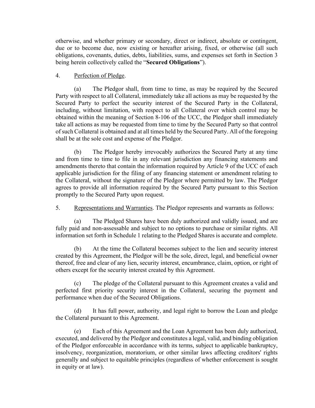 otherwise, and whether primary or secondary, direct or indirect, absolute or contingent, due or to become due, now existing or hereafter arising, fixed, or otherwise (all such obligations, covenants, duties, debts, liabilities, sums, and expenses set forth in Section 3 being herein collectively called the “Secured Obligations”). 4. Perfection of Pledge. (a) The Pledgor shall, from time to time, as may be required by the Secured Party with respect to all Collateral, immediately take all actions as may be requested by the Secured Party to perfect the security interest of the Secured Party in the Collateral, including, without limitation, with respect to all Collateral over which control may be obtained within the meaning of Section 8-106 of the UCC, the Pledgor shall immediately take all actions as may be requested from time to time by the Secured Party so that control of such Collateral is obtained and at all times held by the Secured Party. All of the foregoing shall be at the sole cost and expense of the Pledgor. (b) The Pledgor hereby irrevocably authorizes the Secured Party at any time and from time to time to file in any relevant jurisdiction any financing statements and amendments thereto that contain the information required by Article 9 of the UCC of each applicable jurisdiction for the filing of any financing statement or amendment relating to the Collateral, without the signature of the Pledgor where permitted by law. The Pledgor agrees to provide all information required by the Secured Party pursuant to this Section promptly to the Secured Party upon request. 5. Representations and Warranties. The Pledgor represents and warrants as follows: (a) The Pledged Shares have been duly authorized and validly issued, and are fully paid and non-assessable and subject to no options to purchase or similar rights. All information set forth in Schedule 1 relating to the Pledged Shares is accurate and complete. (b) At the time the Collateral becomes subject to the lien and security interest created by this Agreement, the Pledgor will be the sole, direct, legal, and beneficial owner thereof, free and clear of any lien, security interest, encumbrance, claim, option, or right of others except for the security interest created by this Agreement. (c) The pledge of the Collateral pursuant to this Agreement creates a valid and perfected first priority security interest in the Collateral, securing the payment and performance when due of the Secured Obligations. (d) It has full power, authority, and legal right to borrow the Loan and pledge the Collateral pursuant to this Agreement. (e) Each of this Agreement and the Loan Agreement has been duly authorized, executed, and delivered by the Pledgor and constitutes a legal, valid, and binding obligation of the Pledgor enforceable in accordance with its terms, subject to applicable bankruptcy, insolvency, reorganization, moratorium, or other similar laws affecting creditors' rights generally and subject to equitable principles (regardless of whether enforcement is sought in equity or at law).