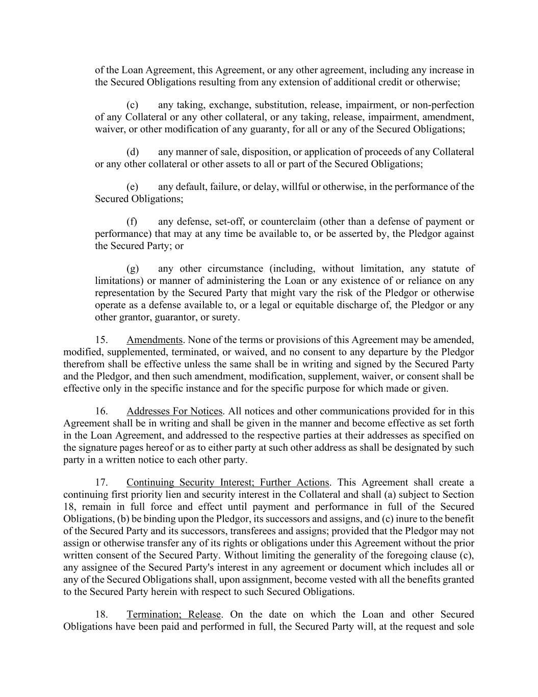 of the Loan Agreement, this Agreement, or any other agreement, including any increase in the Secured Obligations resulting from any extension of additional credit or otherwise; (c) any taking, exchange, substitution, release, impairment, or non-perfection of any Collateral or any other collateral, or any taking, release, impairment, amendment, waiver, or other modification of any guaranty, for all or any of the Secured Obligations; (d) any manner of sale, disposition, or application of proceeds of any Collateral or any other collateral or other assets to all or part of the Secured Obligations; (e) any default, failure, or delay, willful or otherwise, in the performance of the Secured Obligations; (f) any defense, set-off, or counterclaim (other than a defense of payment or performance) that may at any time be available to, or be asserted by, the Pledgor against the Secured Party; or (g) any other circumstance (including, without limitation, any statute of limitations) or manner of administering the Loan or any existence of or reliance on any representation by the Secured Party that might vary the risk of the Pledgor or otherwise operate as a defense available to, or a legal or equitable discharge of, the Pledgor or any other grantor, guarantor, or surety. 15. Amendments. None of the terms or provisions of this Agreement may be amended, modified, supplemented, terminated, or waived, and no consent to any departure by the Pledgor therefrom shall be effective unless the same shall be in writing and signed by the Secured Party and the Pledgor, and then such amendment, modification, supplement, waiver, or consent shall be effective only in the specific instance and for the specific purpose for which made or given. 16. Addresses For Notices. All notices and other communications provided for in this Agreement shall be in writing and shall be given in the manner and become effective as set forth in the Loan Agreement, and addressed to the respective parties at their addresses as specified on the signature pages hereof or as to either party at such other address as shall be designated by such party in a written notice to each other party. 17. Continuing Security Interest; Further Actions. This Agreement shall create a continuing first priority lien and security interest in the Collateral and shall (a) subject to Section 18, remain in full force and effect until payment and performance in full of the Secured Obligations, (b) be binding upon the Pledgor, its successors and assigns, and (c) inure to the benefit of the Secured Party and its successors, transferees and assigns; provided that the Pledgor may not assign or otherwise transfer any of its rights or obligations under this Agreement without the prior written consent of the Secured Party. Without limiting the generality of the foregoing clause (c), any assignee of the Secured Party's interest in any agreement or document which includes all or any of the Secured Obligations shall, upon assignment, become vested with all the benefits granted to the Secured Party herein with respect to such Secured Obligations. 18. Termination; Release. On the date on which the Loan and other Secured Obligations have been paid and performed in full, the Secured Party will, at the request and sole