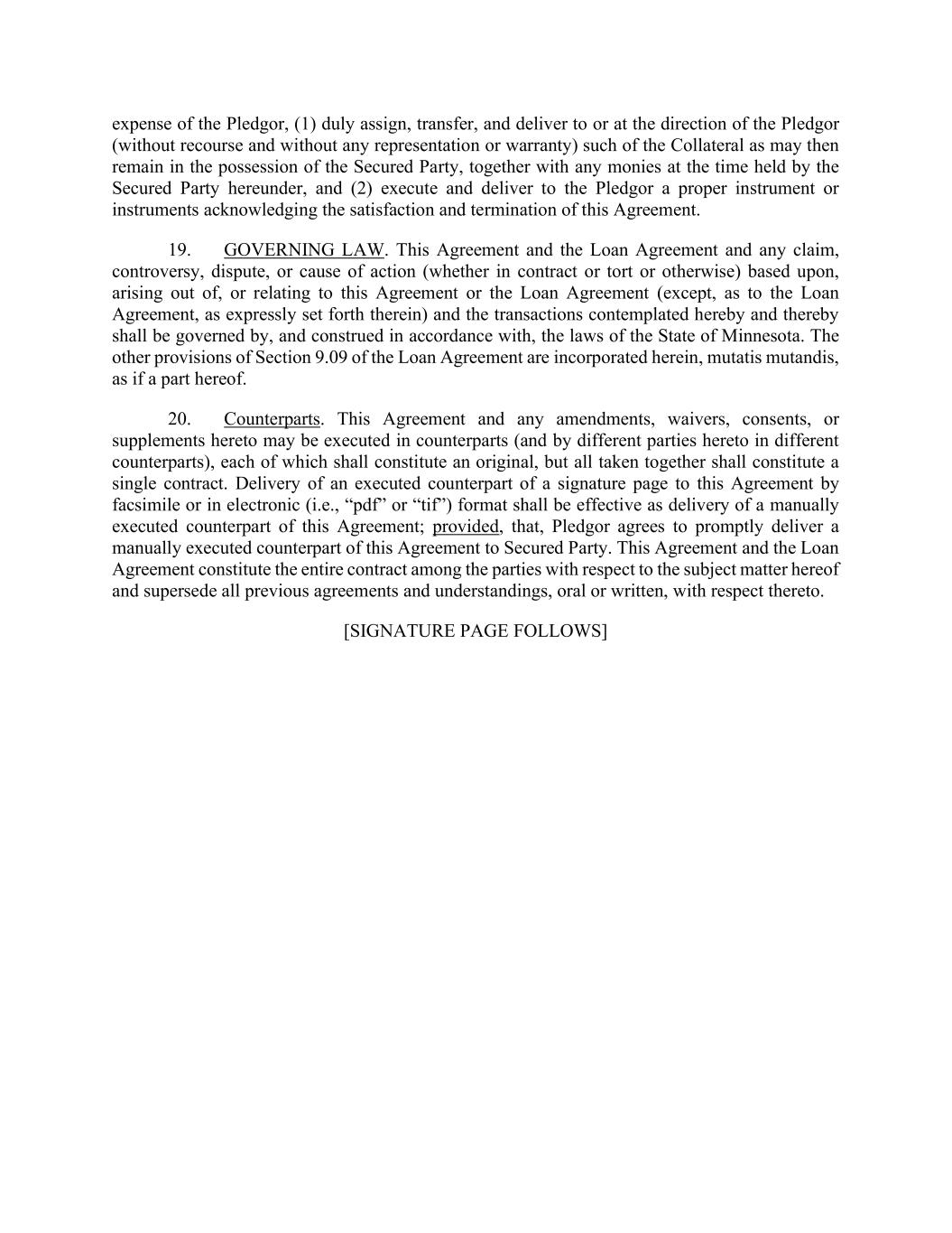expense of the Pledgor, (1) duly assign, transfer, and deliver to or at the direction of the Pledgor (without recourse and without any representation or warranty) such of the Collateral as may then remain in the possession of the Secured Party, together with any monies at the time held by the Secured Party hereunder, and (2) execute and deliver to the Pledgor a proper instrument or instruments acknowledging the satisfaction and termination of this Agreement. 19. GOVERNING LAW. This Agreement and the Loan Agreement and any claim, controversy, dispute, or cause of action (whether in contract or tort or otherwise) based upon, arising out of, or relating to this Agreement or the Loan Agreement (except, as to the Loan Agreement, as expressly set forth therein) and the transactions contemplated hereby and thereby shall be governed by, and construed in accordance with, the laws of the State of Minnesota. The other provisions of Section 9.09 of the Loan Agreement are incorporated herein, mutatis mutandis, as if a part hereof. 20. Counterparts. This Agreement and any amendments, waivers, consents, or supplements hereto may be executed in counterparts (and by different parties hereto in different counterparts), each of which shall constitute an original, but all taken together shall constitute a single contract. Delivery of an executed counterpart of a signature page to this Agreement by facsimile or in electronic (i.e., “pdf” or “tif”) format shall be effective as delivery of a manually executed counterpart of this Agreement; provided, that, Pledgor agrees to promptly deliver a manually executed counterpart of this Agreement to Secured Party. This Agreement and the Loan Agreement constitute the entire contract among the parties with respect to the subject matter hereof and supersede all previous agreements and understandings, oral or written, with respect thereto. [SIGNATURE PAGE FOLLOWS]
