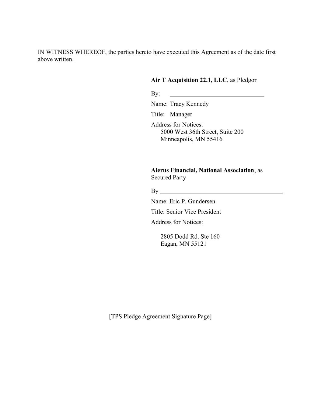 IN WITNESS WHEREOF, the parties hereto have executed this Agreement as of the date first above written. Air T Acquisition 22.1, LLC, as Pledgor By: Name: Tracy Kennedy Title: Manager Address for Notices: 5000 West 36th Street, Suite 200 Minneapolis, MN 55416 Alerus Financial, National Association, as Secured Party By Name: Eric P. Gundersen Title: Senior Vice President Address for Notices: 2805 Dodd Rd. Ste 160 Eagan, MN 55121 [TPS Pledge Agreement Signature Page]