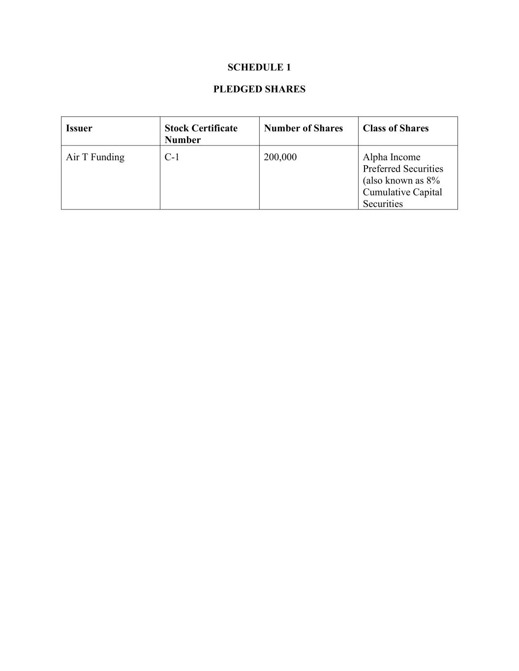 SCHEDULE 1 PLEDGED SHARES Issuer Stock Certificate Number Number of Shares Class of Shares Air T Funding C-1 200,000 Alpha Income Preferred Securities (also known as 8% Cumulative Capital Securities