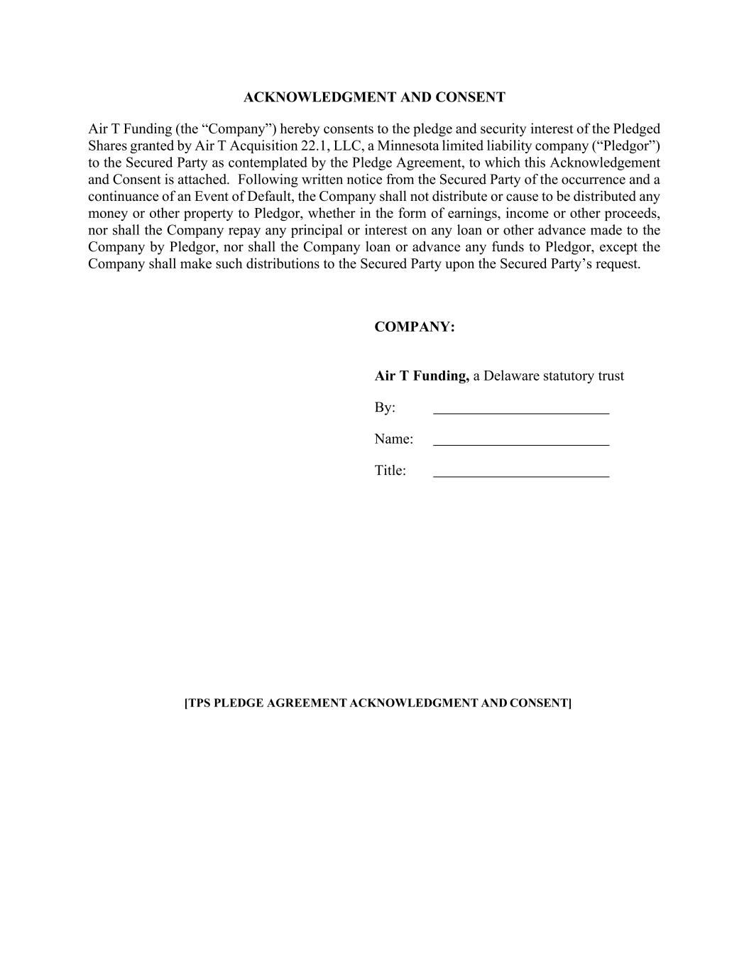 ACKNOWLEDGMENT AND CONSENT Air T Funding (the “Company”) hereby consents to the pledge and security interest of the Pledged Shares granted by Air T Acquisition 22.1, LLC, a Minnesota limited liability company (“Pledgor”) to the Secured Party as contemplated by the Pledge Agreement, to which this Acknowledgement and Consent is attached. Following written notice from the Secured Party of the occurrence and a continuance of an Event of Default, the Company shall not distribute or cause to be distributed any money or other property to Pledgor, whether in the form of earnings, income or other proceeds, nor shall the Company repay any principal or interest on any loan or other advance made to the Company by Pledgor, nor shall the Company loan or advance any funds to Pledgor, except the Company shall make such distributions to the Secured Party upon the Secured Party’s request. COMPANY: Air T Funding, a Delaware statutory trust By: Name: Title: [TPS PLEDGE AGREEMENT ACKNOWLEDGMENT AND CONSENT]