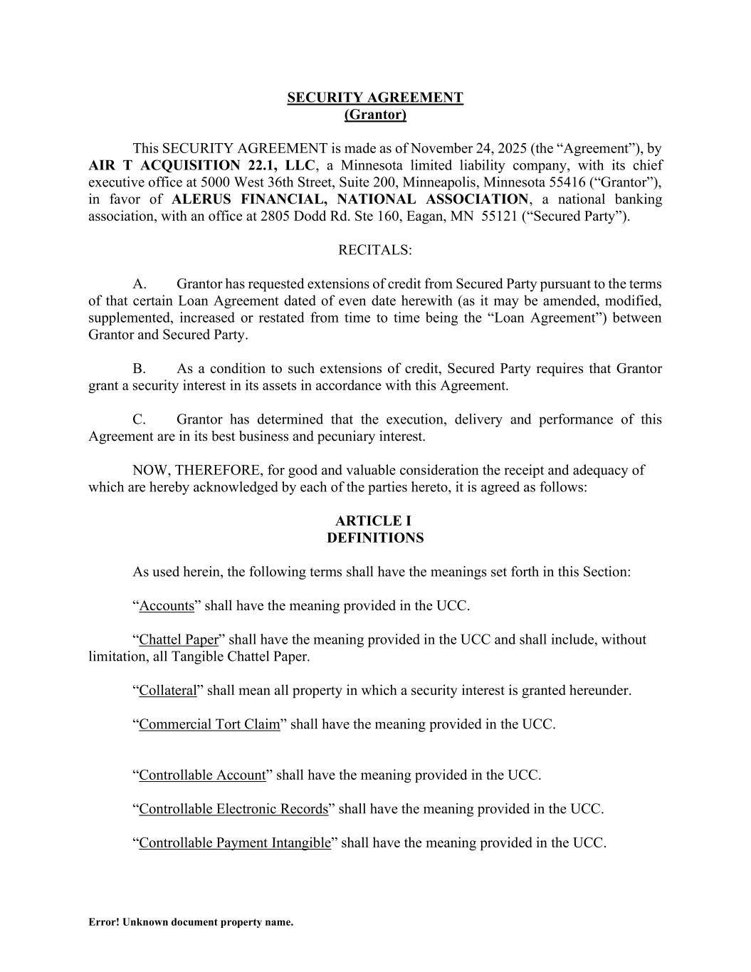 Error! Unknown document property name. SECURITY AGREEMENT (Grantor) This SECURITY AGREEMENT is made as of November 24, 2025 (the “Agreement”), by AIR T ACQUISITION 22.1, LLC, a Minnesota limited liability company, with its chief executive office at 5000 West 36th Street, Suite 200, Minneapolis, Minnesota 55416 (“Grantor”), in favor of ALERUS FINANCIAL, NATIONAL ASSOCIATION, a national banking association, with an office at 2805 Dodd Rd. Ste 160, Eagan, MN 55121 (“Secured Party”). RECITALS: A. Grantor has requested extensions of credit from Secured Party pursuant to the terms of that certain Loan Agreement dated of even date herewith (as it may be amended, modified, supplemented, increased or restated from time to time being the “Loan Agreement”) between Grantor and Secured Party. B. As a condition to such extensions of credit, Secured Party requires that Grantor grant a security interest in its assets in accordance with this Agreement. C. Grantor has determined that the execution, delivery and performance of this Agreement are in its best business and pecuniary interest. NOW, THEREFORE, for good and valuable consideration the receipt and adequacy of which are hereby acknowledged by each of the parties hereto, it is agreed as follows: ARTICLE I DEFINITIONS As used herein, the following terms shall have the meanings set forth in this Section: “Accounts” shall have the meaning provided in the UCC. “Chattel Paper” shall have the meaning provided in the UCC and shall include, without limitation, all Tangible Chattel Paper. “Collateral” shall mean all property in which a security interest is granted hereunder. “Commercial Tort Claim” shall have the meaning provided in the UCC. “Controllable Account” shall have the meaning provided in the UCC. “Controllable Electronic Records” shall have the meaning provided in the UCC. “Controllable Payment Intangible” shall have the meaning provided in the UCC.