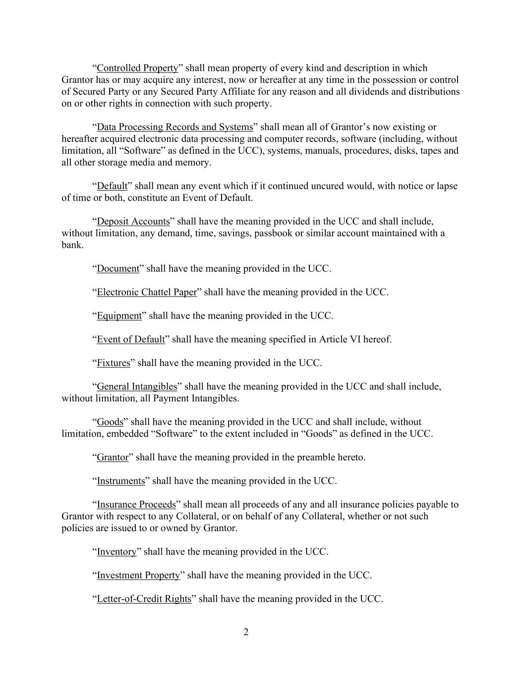2 “Controlled Property” shall mean property of every kind and description in which Grantor has or may acquire any interest, now or hereafter at any time in the possession or control of Secured Party or any Secured Party Affiliate for any reason and all dividends and distributions on or other rights in connection with such property. “Data Processing Records and Systems” shall mean all of Grantor’s now existing or hereafter acquired electronic data processing and computer records, software (including, without limitation, all “Software” as defined in the UCC), systems, manuals, procedures, disks, tapes and all other storage media and memory. “Default” shall mean any event which if it continued uncured would, with notice or lapse of time or both, constitute an Event of Default. “Deposit Accounts” shall have the meaning provided in the UCC and shall include, without limitation, any demand, time, savings, passbook or similar account maintained with a bank. “Document” shall have the meaning provided in the UCC. “Electronic Chattel Paper” shall have the meaning provided in the UCC. “Equipment” shall have the meaning provided in the UCC. “Event of Default” shall have the meaning specified in Article VI hereof. “Fixtures” shall have the meaning provided in the UCC. “General Intangibles” shall have the meaning provided in the UCC and shall include, without limitation, all Payment Intangibles. “Goods” shall have the meaning provided in the UCC and shall include, without limitation, embedded “Software” to the extent included in “Goods” as defined in the UCC. “Grantor” shall have the meaning provided in the preamble hereto. “Instruments” shall have the meaning provided in the UCC. “Insurance Proceeds” shall mean all proceeds of any and all insurance policies payable to Grantor with respect to any Collateral, or on behalf of any Collateral, whether or not such policies are issued to or owned by Grantor. “Inventory” shall have the meaning provided in the UCC. “Investment Property” shall have the meaning provided in the UCC. “Letter-of-Credit Rights” shall have the meaning provided in the UCC.