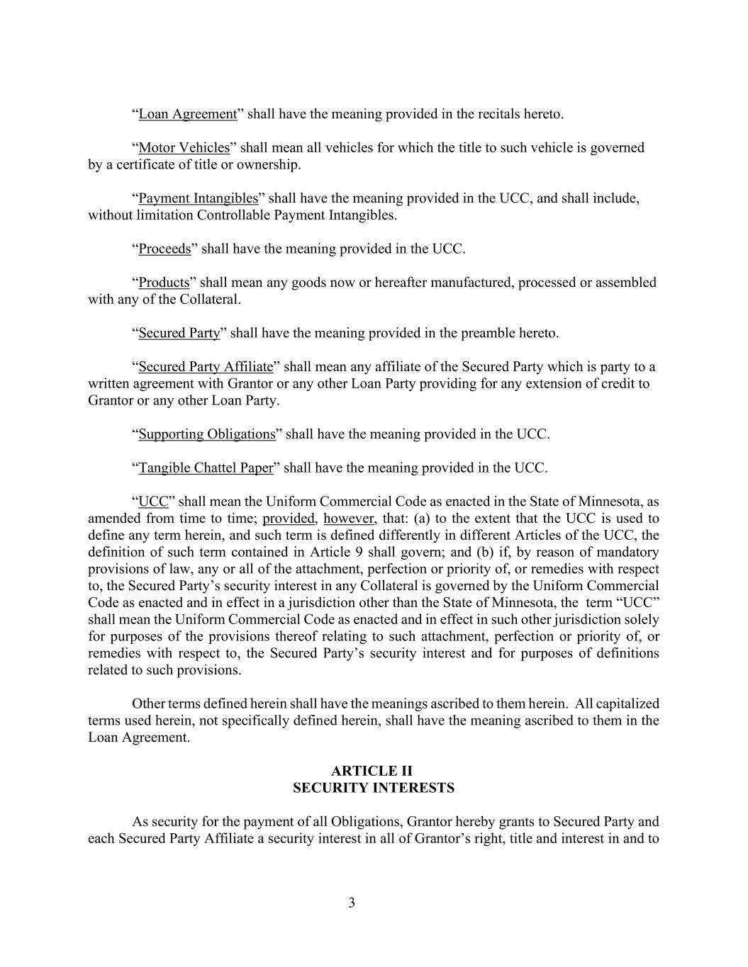 3 “Loan Agreement” shall have the meaning provided in the recitals hereto. “Motor Vehicles” shall mean all vehicles for which the title to such vehicle is governed by a certificate of title or ownership. “Payment Intangibles” shall have the meaning provided in the UCC, and shall include, without limitation Controllable Payment Intangibles. “Proceeds” shall have the meaning provided in the UCC. “Products” shall mean any goods now or hereafter manufactured, processed or assembled with any of the Collateral. “Secured Party” shall have the meaning provided in the preamble hereto. “Secured Party Affiliate” shall mean any affiliate of the Secured Party which is party to a written agreement with Grantor or any other Loan Party providing for any extension of credit to Grantor or any other Loan Party. “Supporting Obligations” shall have the meaning provided in the UCC. “Tangible Chattel Paper” shall have the meaning provided in the UCC. “UCC” shall mean the Uniform Commercial Code as enacted in the State of Minnesota, as amended from time to time; provided, however, that: (a) to the extent that the UCC is used to define any term herein, and such term is defined differently in different Articles of the UCC, the definition of such term contained in Article 9 shall govern; and (b) if, by reason of mandatory provisions of law, any or all of the attachment, perfection or priority of, or remedies with respect to, the Secured Party’s security interest in any Collateral is governed by the Uniform Commercial Code as enacted and in effect in a jurisdiction other than the State of Minnesota, the term “UCC” shall mean the Uniform Commercial Code as enacted and in effect in such other jurisdiction solely for purposes of the provisions thereof relating to such attachment, perfection or priority of, or remedies with respect to, the Secured Party’s security interest and for purposes of definitions related to such provisions. Other terms defined herein shall have the meanings ascribed to them herein. All capitalized terms used herein, not specifically defined herein, shall have the meaning ascribed to them in the Loan Agreement. ARTICLE II SECURITY INTERESTS As security for the payment of all Obligations, Grantor hereby grants to Secured Party and each Secured Party Affiliate a security interest in all of Grantor’s right, title and interest in and to