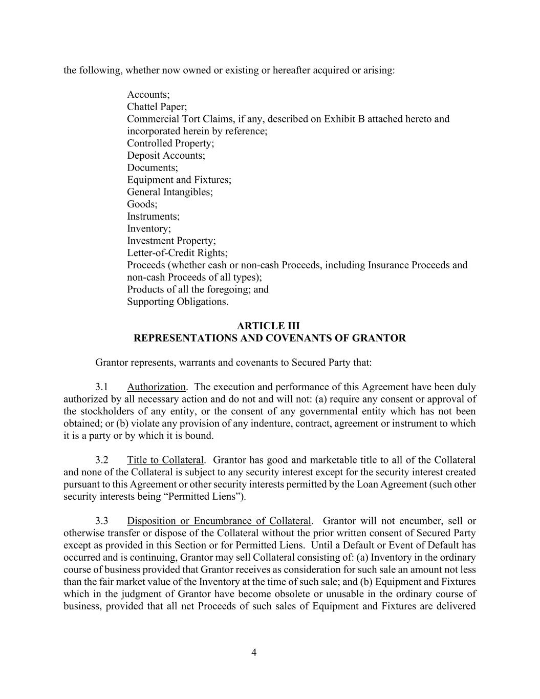 4 the following, whether now owned or existing or hereafter acquired or arising: Accounts; Chattel Paper; Commercial Tort Claims, if any, described on Exhibit B attached hereto and incorporated herein by reference; Controlled Property; Deposit Accounts; Documents; Equipment and Fixtures; General Intangibles; Goods; Instruments; Inventory; Investment Property; Letter-of-Credit Rights; Proceeds (whether cash or non-cash Proceeds, including Insurance Proceeds and non-cash Proceeds of all types); Products of all the foregoing; and Supporting Obligations. ARTICLE III REPRESENTATIONS AND COVENANTS OF GRANTOR Grantor represents, warrants and covenants to Secured Party that: 3.1 Authorization. The execution and performance of this Agreement have been duly authorized by all necessary action and do not and will not: (a) require any consent or approval of the stockholders of any entity, or the consent of any governmental entity which has not been obtained; or (b) violate any provision of any indenture, contract, agreement or instrument to which it is a party or by which it is bound. 3.2 Title to Collateral. Grantor has good and marketable title to all of the Collateral and none of the Collateral is subject to any security interest except for the security interest created pursuant to this Agreement or other security interests permitted by the Loan Agreement (such other security interests being “Permitted Liens”). 3.3 Disposition or Encumbrance of Collateral. Grantor will not encumber, sell or otherwise transfer or dispose of the Collateral without the prior written consent of Secured Party except as provided in this Section or for Permitted Liens. Until a Default or Event of Default has occurred and is continuing, Grantor may sell Collateral consisting of: (a) Inventory in the ordinary course of business provided that Grantor receives as consideration for such sale an amount not less than the fair market value of the Inventory at the time of such sale; and (b) Equipment and Fixtures which in the judgment of Grantor have become obsolete or unusable in the ordinary course of business, provided that all net Proceeds of such sales of Equipment and Fixtures are delivered
