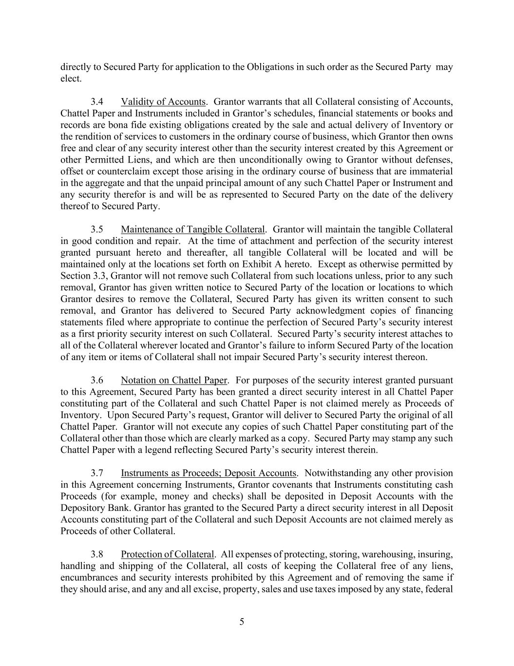 5 directly to Secured Party for application to the Obligations in such order as the Secured Party may elect. 3.4 Validity of Accounts. Grantor warrants that all Collateral consisting of Accounts, Chattel Paper and Instruments included in Grantor’s schedules, financial statements or books and records are bona fide existing obligations created by the sale and actual delivery of Inventory or the rendition of services to customers in the ordinary course of business, which Grantor then owns free and clear of any security interest other than the security interest created by this Agreement or other Permitted Liens, and which are then unconditionally owing to Grantor without defenses, offset or counterclaim except those arising in the ordinary course of business that are immaterial in the aggregate and that the unpaid principal amount of any such Chattel Paper or Instrument and any security therefor is and will be as represented to Secured Party on the date of the delivery thereof to Secured Party. 3.5 Maintenance of Tangible Collateral. Grantor will maintain the tangible Collateral in good condition and repair. At the time of attachment and perfection of the security interest granted pursuant hereto and thereafter, all tangible Collateral will be located and will be maintained only at the locations set forth on Exhibit A hereto. Except as otherwise permitted by Section 3.3, Grantor will not remove such Collateral from such locations unless, prior to any such removal, Grantor has given written notice to Secured Party of the location or locations to which Grantor desires to remove the Collateral, Secured Party has given its written consent to such removal, and Grantor has delivered to Secured Party acknowledgment copies of financing statements filed where appropriate to continue the perfection of Secured Party’s security interest as a first priority security interest on such Collateral. Secured Party’s security interest attaches to all of the Collateral wherever located and Grantor’s failure to inform Secured Party of the location of any item or items of Collateral shall not impair Secured Party’s security interest thereon. 3.6 Notation on Chattel Paper. For purposes of the security interest granted pursuant to this Agreement, Secured Party has been granted a direct security interest in all Chattel Paper constituting part of the Collateral and such Chattel Paper is not claimed merely as Proceeds of Inventory. Upon Secured Party’s request, Grantor will deliver to Secured Party the original of all Chattel Paper. Grantor will not execute any copies of such Chattel Paper constituting part of the Collateral other than those which are clearly marked as a copy. Secured Party may stamp any such Chattel Paper with a legend reflecting Secured Party’s security interest therein. 3.7 Instruments as Proceeds; Deposit Accounts. Notwithstanding any other provision in this Agreement concerning Instruments, Grantor covenants that Instruments constituting cash Proceeds (for example, money and checks) shall be deposited in Deposit Accounts with the Depository Bank. Grantor has granted to the Secured Party a direct security interest in all Deposit Accounts constituting part of the Collateral and such Deposit Accounts are not claimed merely as Proceeds of other Collateral. 3.8 Protection of Collateral. All expenses of protecting, storing, warehousing, insuring, handling and shipping of the Collateral, all costs of keeping the Collateral free of any liens, encumbrances and security interests prohibited by this Agreement and of removing the same if they should arise, and any and all excise, property, sales and use taxes imposed by any state, federal