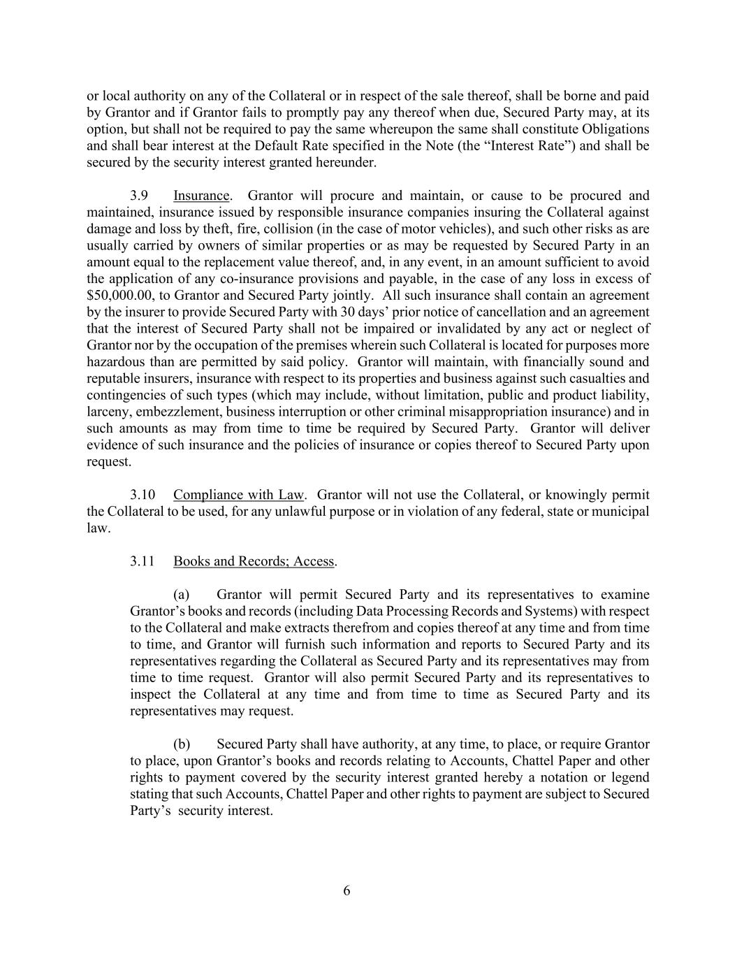 6 or local authority on any of the Collateral or in respect of the sale thereof, shall be borne and paid by Grantor and if Grantor fails to promptly pay any thereof when due, Secured Party may, at its option, but shall not be required to pay the same whereupon the same shall constitute Obligations and shall bear interest at the Default Rate specified in the Note (the “Interest Rate”) and shall be secured by the security interest granted hereunder. 3.9 Insurance. Grantor will procure and maintain, or cause to be procured and maintained, insurance issued by responsible insurance companies insuring the Collateral against damage and loss by theft, fire, collision (in the case of motor vehicles), and such other risks as are usually carried by owners of similar properties or as may be requested by Secured Party in an amount equal to the replacement value thereof, and, in any event, in an amount sufficient to avoid the application of any co-insurance provisions and payable, in the case of any loss in excess of $50,000.00, to Grantor and Secured Party jointly. All such insurance shall contain an agreement by the insurer to provide Secured Party with 30 days’ prior notice of cancellation and an agreement that the interest of Secured Party shall not be impaired or invalidated by any act or neglect of Grantor nor by the occupation of the premises wherein such Collateral is located for purposes more hazardous than are permitted by said policy. Grantor will maintain, with financially sound and reputable insurers, insurance with respect to its properties and business against such casualties and contingencies of such types (which may include, without limitation, public and product liability, larceny, embezzlement, business interruption or other criminal misappropriation insurance) and in such amounts as may from time to time be required by Secured Party. Grantor will deliver evidence of such insurance and the policies of insurance or copies thereof to Secured Party upon request. 3.10 Compliance with Law. Grantor will not use the Collateral, or knowingly permit the Collateral to be used, for any unlawful purpose or in violation of any federal, state or municipal law. 3.11 Books and Records; Access. (a) Grantor will permit Secured Party and its representatives to examine Grantor’s books and records (including Data Processing Records and Systems) with respect to the Collateral and make extracts therefrom and copies thereof at any time and from time to time, and Grantor will furnish such information and reports to Secured Party and its representatives regarding the Collateral as Secured Party and its representatives may from time to time request. Grantor will also permit Secured Party and its representatives to inspect the Collateral at any time and from time to time as Secured Party and its representatives may request. (b) Secured Party shall have authority, at any time, to place, or require Grantor to place, upon Grantor’s books and records relating to Accounts, Chattel Paper and other rights to payment covered by the security interest granted hereby a notation or legend stating that such Accounts, Chattel Paper and other rights to payment are subject to Secured Party’s security interest.