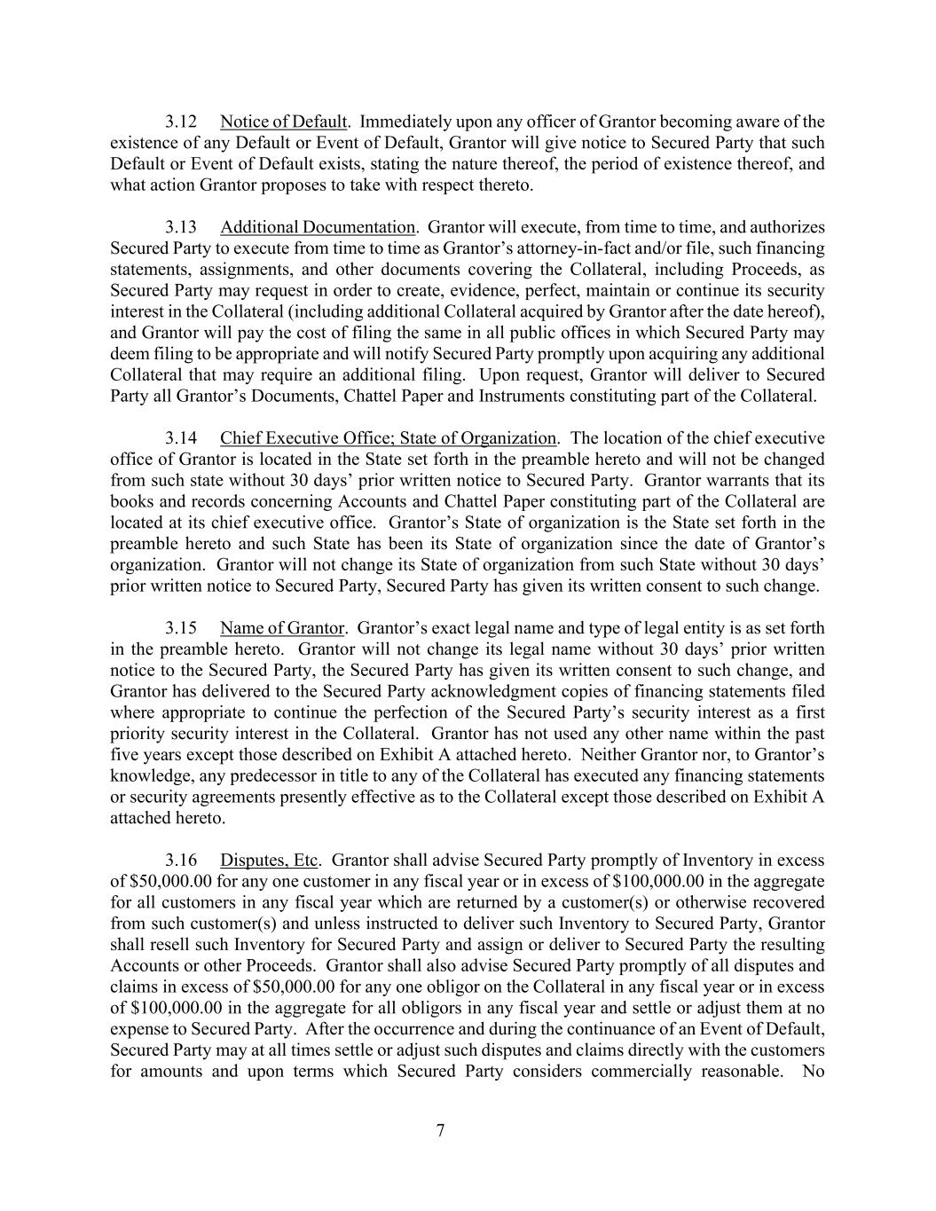 7 3.12 Notice of Default. Immediately upon any officer of Grantor becoming aware of the existence of any Default or Event of Default, Grantor will give notice to Secured Party that such Default or Event of Default exists, stating the nature thereof, the period of existence thereof, and what action Grantor proposes to take with respect thereto. 3.13 Additional Documentation. Grantor will execute, from time to time, and authorizes Secured Party to execute from time to time as Grantor’s attorney-in-fact and/or file, such financing statements, assignments, and other documents covering the Collateral, including Proceeds, as Secured Party may request in order to create, evidence, perfect, maintain or continue its security interest in the Collateral (including additional Collateral acquired by Grantor after the date hereof), and Grantor will pay the cost of filing the same in all public offices in which Secured Party may deem filing to be appropriate and will notify Secured Party promptly upon acquiring any additional Collateral that may require an additional filing. Upon request, Grantor will deliver to Secured Party all Grantor’s Documents, Chattel Paper and Instruments constituting part of the Collateral. 3.14 Chief Executive Office; State of Organization. The location of the chief executive office of Grantor is located in the State set forth in the preamble hereto and will not be changed from such state without 30 days’ prior written notice to Secured Party. Grantor warrants that its books and records concerning Accounts and Chattel Paper constituting part of the Collateral are located at its chief executive office. Grantor’s State of organization is the State set forth in the preamble hereto and such State has been its State of organization since the date of Grantor’s organization. Grantor will not change its State of organization from such State without 30 days’ prior written notice to Secured Party, Secured Party has given its written consent to such change. 3.15 Name of Grantor. Grantor’s exact legal name and type of legal entity is as set forth in the preamble hereto. Grantor will not change its legal name without 30 days’ prior written notice to the Secured Party, the Secured Party has given its written consent to such change, and Grantor has delivered to the Secured Party acknowledgment copies of financing statements filed where appropriate to continue the perfection of the Secured Party’s security interest as a first priority security interest in the Collateral. Grantor has not used any other name within the past five years except those described on Exhibit A attached hereto. Neither Grantor nor, to Grantor’s knowledge, any predecessor in title to any of the Collateral has executed any financing statements or security agreements presently effective as to the Collateral except those described on Exhibit A attached hereto. 3.16 Disputes, Etc. Grantor shall advise Secured Party promptly of Inventory in excess of $50,000.00 for any one customer in any fiscal year or in excess of $100,000.00 in the aggregate for all customers in any fiscal year which are returned by a customer(s) or otherwise recovered from such customer(s) and unless instructed to deliver such Inventory to Secured Party, Grantor shall resell such Inventory for Secured Party and assign or deliver to Secured Party the resulting Accounts or other Proceeds. Grantor shall also advise Secured Party promptly of all disputes and claims in excess of $50,000.00 for any one obligor on the Collateral in any fiscal year or in excess of $100,000.00 in the aggregate for all obligors in any fiscal year and settle or adjust them at no expense to Secured Party. After the occurrence and during the continuance of an Event of Default, Secured Party may at all times settle or adjust such disputes and claims directly with the customers for amounts and upon terms which Secured Party considers commercially reasonable. No