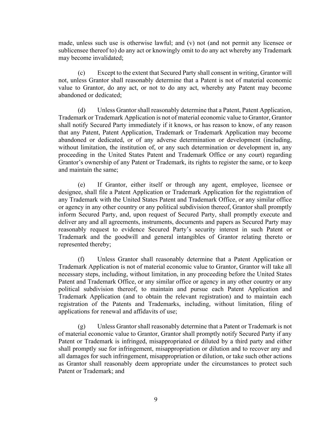 9 made, unless such use is otherwise lawful; and (v) not (and not permit any licensee or sublicensee thereof to) do any act or knowingly omit to do any act whereby any Trademark may become invalidated; (c) Except to the extent that Secured Party shall consent in writing, Grantor will not, unless Grantor shall reasonably determine that a Patent is not of material economic value to Grantor, do any act, or not to do any act, whereby any Patent may become abandoned or dedicated; (d) Unless Grantor shall reasonably determine that a Patent, Patent Application, Trademark or Trademark Application is not of material economic value to Grantor, Grantor shall notify Secured Party immediately if it knows, or has reason to know, of any reason that any Patent, Patent Application, Trademark or Trademark Application may become abandoned or dedicated, or of any adverse determination or development (including, without limitation, the institution of, or any such determination or development in, any proceeding in the United States Patent and Trademark Office or any court) regarding Grantor’s ownership of any Patent or Trademark, its rights to register the same, or to keep and maintain the same; (e) If Grantor, either itself or through any agent, employee, licensee or designee, shall file a Patent Application or Trademark Application for the registration of any Trademark with the United States Patent and Trademark Office, or any similar office or agency in any other country or any political subdivision thereof, Grantor shall promptly inform Secured Party, and, upon request of Secured Party, shall promptly execute and deliver any and all agreements, instruments, documents and papers as Secured Party may reasonably request to evidence Secured Party’s security interest in such Patent or Trademark and the goodwill and general intangibles of Grantor relating thereto or represented thereby; (f) Unless Grantor shall reasonably determine that a Patent Application or Trademark Application is not of material economic value to Grantor, Grantor will take all necessary steps, including, without limitation, in any proceeding before the United States Patent and Trademark Office, or any similar office or agency in any other country or any political subdivision thereof, to maintain and pursue each Patent Application and Trademark Application (and to obtain the relevant registration) and to maintain each registration of the Patents and Trademarks, including, without limitation, filing of applications for renewal and affidavits of use; (g) Unless Grantor shall reasonably determine that a Patent or Trademark is not of material economic value to Grantor, Grantor shall promptly notify Secured Party if any Patent or Trademark is infringed, misappropriated or diluted by a third party and either shall promptly sue for infringement, misappropriation or dilution and to recover any and all damages for such infringement, misappropriation or dilution, or take such other actions as Grantor shall reasonably deem appropriate under the circumstances to protect such Patent or Trademark; and