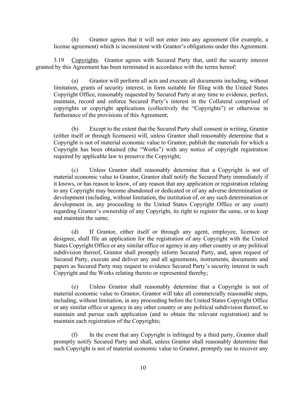 10 (h) Grantor agrees that it will not enter into any agreement (for example, a license agreement) which is inconsistent with Grantor’s obligations under this Agreement. 3.19 Copyrights. Grantor agrees with Secured Party that, until the security interest granted by this Agreement has been terminated in accordance with the terms hereof: (a) Grantor will perform all acts and execute all documents including, without limitation, grants of security interest, in form suitable for filing with the United States Copyright Office, reasonably requested by Secured Party at any time to evidence, perfect, maintain, record and enforce Secured Party’s interest in the Collateral comprised of copyrights or copyright applications (collectively the “Copyrights”) or otherwise in furtherance of the provisions of this Agreement; (b) Except to the extent that the Secured Party shall consent in writing, Grantor (either itself or through licensees) will, unless Grantor shall reasonably determine that a Copyright is not of material economic value to Grantor, publish the materials for which a Copyright has been obtained (the “Works”) with any notice of copyright registration required by applicable law to preserve the Copyright; (c) Unless Grantor shall reasonably determine that a Copyright is not of material economic value to Grantor, Grantor shall notify the Secured Party immediately if it knows, or has reason to know, of any reason that any application or registration relating to any Copyright may become abandoned or dedicated or of any adverse determination or development (including, without limitation, the institution of, or any such determination or development in, any proceeding in the United States Copyright Office or any court) regarding Grantor’s ownership of any Copyright, its right to register the same, or to keep and maintain the same; (d) If Grantor, either itself or through any agent, employee, licensee or designee, shall file an application for the registration of any Copyright with the United States Copyright Office or any similar office or agency in any other country or any political subdivision thereof, Grantor shall promptly inform Secured Party, and, upon request of Secured Party, execute and deliver any and all agreements, instruments, documents and papers as Secured Party may request to evidence Secured Party’s security interest in such Copyright and the Works relating thereto or represented thereby; (e) Unless Grantor shall reasonably determine that a Copyright is not of material economic value to Grantor, Grantor will take all commercially reasonable steps, including, without limitation, in any proceeding before the United States Copyright Office or any similar office or agency in any other country or any political subdivision thereof, to maintain and pursue each application (and to obtain the relevant registration) and to maintain each registration of the Copyrights; (f) In the event that any Copyright is infringed by a third party, Grantor shall promptly notify Secured Party and shall, unless Grantor shall reasonably determine that such Copyright is not of material economic value to Grantor, promptly sue to recover any