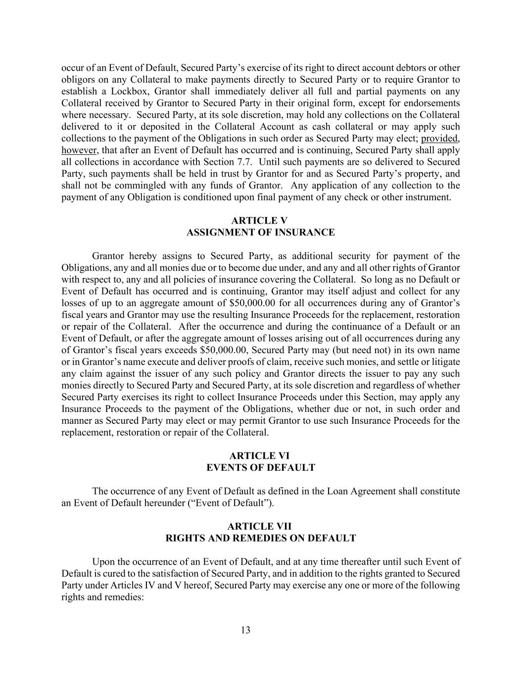 13 occur of an Event of Default, Secured Party’s exercise of its right to direct account debtors or other obligors on any Collateral to make payments directly to Secured Party or to require Grantor to establish a Lockbox, Grantor shall immediately deliver all full and partial payments on any Collateral received by Grantor to Secured Party in their original form, except for endorsements where necessary. Secured Party, at its sole discretion, may hold any collections on the Collateral delivered to it or deposited in the Collateral Account as cash collateral or may apply such collections to the payment of the Obligations in such order as Secured Party may elect; provided, however, that after an Event of Default has occurred and is continuing, Secured Party shall apply all collections in accordance with Section 7.7. Until such payments are so delivered to Secured Party, such payments shall be held in trust by Grantor for and as Secured Party’s property, and shall not be commingled with any funds of Grantor. Any application of any collection to the payment of any Obligation is conditioned upon final payment of any check or other instrument. ARTICLE V ASSIGNMENT OF INSURANCE Grantor hereby assigns to Secured Party, as additional security for payment of the Obligations, any and all monies due or to become due under, and any and all other rights of Grantor with respect to, any and all policies of insurance covering the Collateral. So long as no Default or Event of Default has occurred and is continuing, Grantor may itself adjust and collect for any losses of up to an aggregate amount of $50,000.00 for all occurrences during any of Grantor’s fiscal years and Grantor may use the resulting Insurance Proceeds for the replacement, restoration or repair of the Collateral. After the occurrence and during the continuance of a Default or an Event of Default, or after the aggregate amount of losses arising out of all occurrences during any of Grantor’s fiscal years exceeds $50,000.00, Secured Party may (but need not) in its own name or in Grantor’s name execute and deliver proofs of claim, receive such monies, and settle or litigate any claim against the issuer of any such policy and Grantor directs the issuer to pay any such monies directly to Secured Party and Secured Party, at its sole discretion and regardless of whether Secured Party exercises its right to collect Insurance Proceeds under this Section, may apply any Insurance Proceeds to the payment of the Obligations, whether due or not, in such order and manner as Secured Party may elect or may permit Grantor to use such Insurance Proceeds for the replacement, restoration or repair of the Collateral. ARTICLE VI EVENTS OF DEFAULT The occurrence of any Event of Default as defined in the Loan Agreement shall constitute an Event of Default hereunder (“Event of Default”). ARTICLE VII RIGHTS AND REMEDIES ON DEFAULT Upon the occurrence of an Event of Default, and at any time thereafter until such Event of Default is cured to the satisfaction of Secured Party, and in addition to the rights granted to Secured Party under Articles IV and V hereof, Secured Party may exercise any one or more of the following rights and remedies: