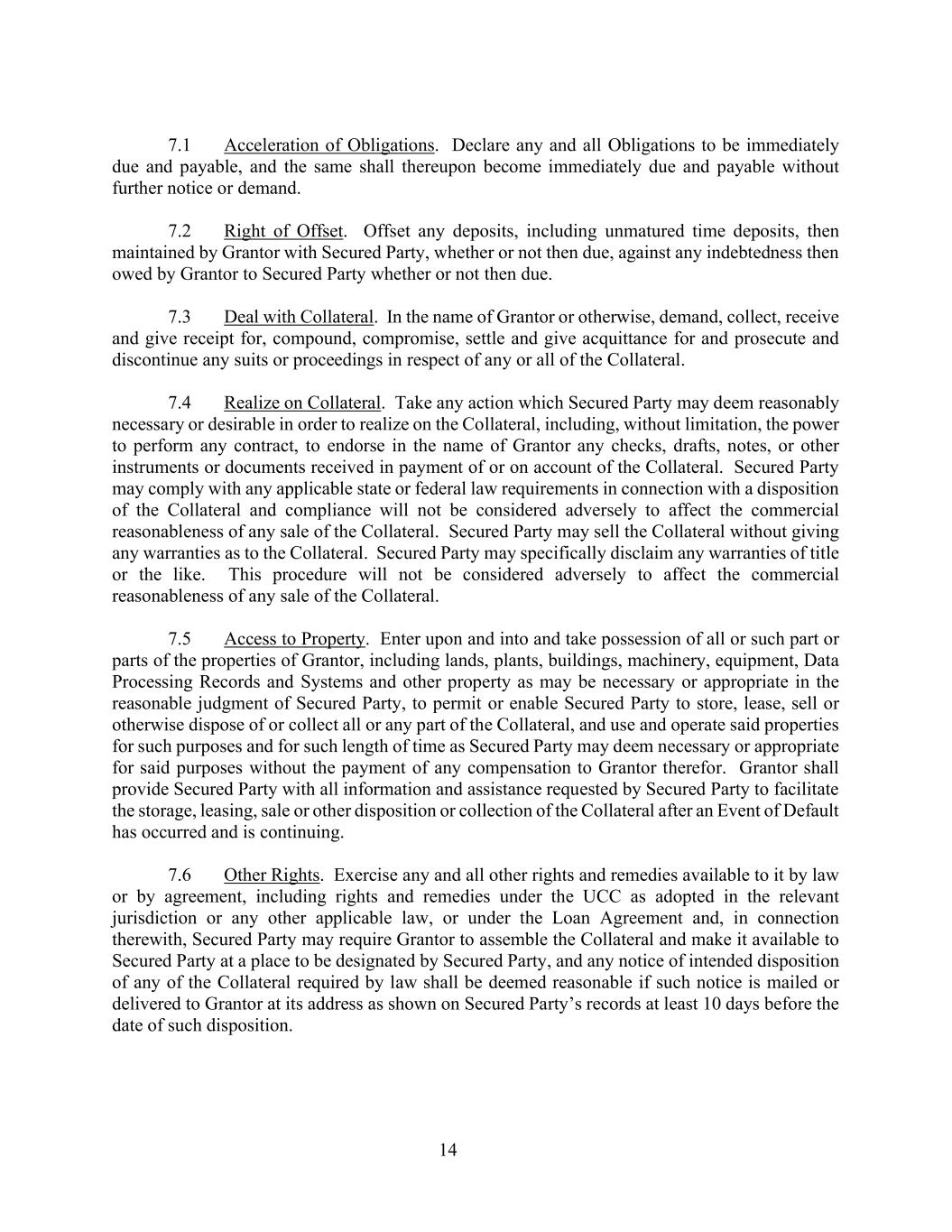 14 7.1 Acceleration of Obligations. Declare any and all Obligations to be immediately due and payable, and the same shall thereupon become immediately due and payable without further notice or demand. 7.2 Right of Offset. Offset any deposits, including unmatured time deposits, then maintained by Grantor with Secured Party, whether or not then due, against any indebtedness then owed by Grantor to Secured Party whether or not then due. 7.3 Deal with Collateral. In the name of Grantor or otherwise, demand, collect, receive and give receipt for, compound, compromise, settle and give acquittance for and prosecute and discontinue any suits or proceedings in respect of any or all of the Collateral. 7.4 Realize on Collateral. Take any action which Secured Party may deem reasonably necessary or desirable in order to realize on the Collateral, including, without limitation, the power to perform any contract, to endorse in the name of Grantor any checks, drafts, notes, or other instruments or documents received in payment of or on account of the Collateral. Secured Party may comply with any applicable state or federal law requirements in connection with a disposition of the Collateral and compliance will not be considered adversely to affect the commercial reasonableness of any sale of the Collateral. Secured Party may sell the Collateral without giving any warranties as to the Collateral. Secured Party may specifically disclaim any warranties of title or the like. This procedure will not be considered adversely to affect the commercial reasonableness of any sale of the Collateral. 7.5 Access to Property. Enter upon and into and take possession of all or such part or parts of the properties of Grantor, including lands, plants, buildings, machinery, equipment, Data Processing Records and Systems and other property as may be necessary or appropriate in the reasonable judgment of Secured Party, to permit or enable Secured Party to store, lease, sell or otherwise dispose of or collect all or any part of the Collateral, and use and operate said properties for such purposes and for such length of time as Secured Party may deem necessary or appropriate for said purposes without the payment of any compensation to Grantor therefor. Grantor shall provide Secured Party with all information and assistance requested by Secured Party to facilitate the storage, leasing, sale or other disposition or collection of the Collateral after an Event of Default has occurred and is continuing. 7.6 Other Rights. Exercise any and all other rights and remedies available to it by law or by agreement, including rights and remedies under the UCC as adopted in the relevant jurisdiction or any other applicable law, or under the Loan Agreement and, in connection therewith, Secured Party may require Grantor to assemble the Collateral and make it available to Secured Party at a place to be designated by Secured Party, and any notice of intended disposition of any of the Collateral required by law shall be deemed reasonable if such notice is mailed or delivered to Grantor at its address as shown on Secured Party’s records at least 10 days before the date of such disposition.