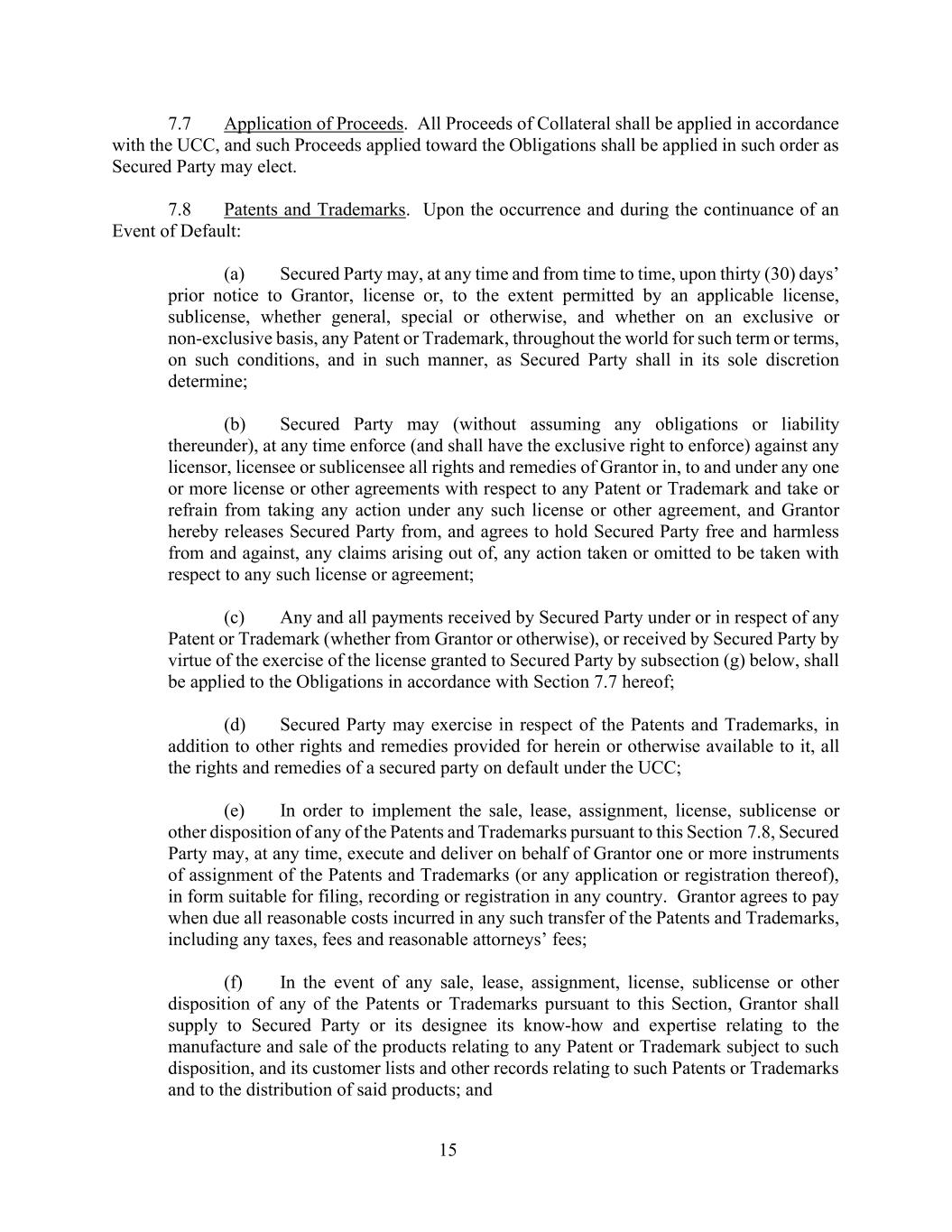 15 7.7 Application of Proceeds. All Proceeds of Collateral shall be applied in accordance with the UCC, and such Proceeds applied toward the Obligations shall be applied in such order as Secured Party may elect. 7.8 Patents and Trademarks. Upon the occurrence and during the continuance of an Event of Default: (a) Secured Party may, at any time and from time to time, upon thirty (30) days’ prior notice to Grantor, license or, to the extent permitted by an applicable license, sublicense, whether general, special or otherwise, and whether on an exclusive or non-exclusive basis, any Patent or Trademark, throughout the world for such term or terms, on such conditions, and in such manner, as Secured Party shall in its sole discretion determine; (b) Secured Party may (without assuming any obligations or liability thereunder), at any time enforce (and shall have the exclusive right to enforce) against any licensor, licensee or sublicensee all rights and remedies of Grantor in, to and under any one or more license or other agreements with respect to any Patent or Trademark and take or refrain from taking any action under any such license or other agreement, and Grantor hereby releases Secured Party from, and agrees to hold Secured Party free and harmless from and against, any claims arising out of, any action taken or omitted to be taken with respect to any such license or agreement; (c) Any and all payments received by Secured Party under or in respect of any Patent or Trademark (whether from Grantor or otherwise), or received by Secured Party by virtue of the exercise of the license granted to Secured Party by subsection (g) below, shall be applied to the Obligations in accordance with Section 7.7 hereof; (d) Secured Party may exercise in respect of the Patents and Trademarks, in addition to other rights and remedies provided for herein or otherwise available to it, all the rights and remedies of a secured party on default under the UCC; (e) In order to implement the sale, lease, assignment, license, sublicense or other disposition of any of the Patents and Trademarks pursuant to this Section 7.8, Secured Party may, at any time, execute and deliver on behalf of Grantor one or more instruments of assignment of the Patents and Trademarks (or any application or registration thereof), in form suitable for filing, recording or registration in any country. Grantor agrees to pay when due all reasonable costs incurred in any such transfer of the Patents and Trademarks, including any taxes, fees and reasonable attorneys’ fees; (f) In the event of any sale, lease, assignment, license, sublicense or other disposition of any of the Patents or Trademarks pursuant to this Section, Grantor shall supply to Secured Party or its designee its know-how and expertise relating to the manufacture and sale of the products relating to any Patent or Trademark subject to such disposition, and its customer lists and other records relating to such Patents or Trademarks and to the distribution of said products; and